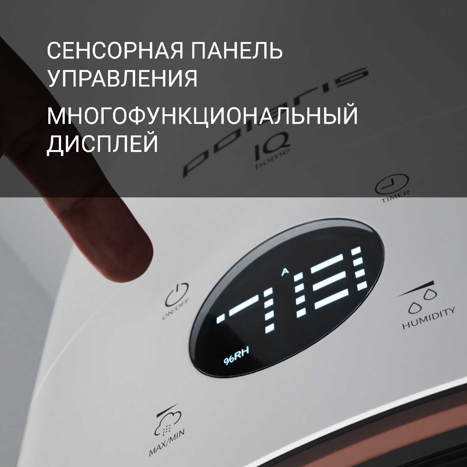 - Сенсорные кнопки для настройки режимов, таймера (до 12 часов) и влажности.
