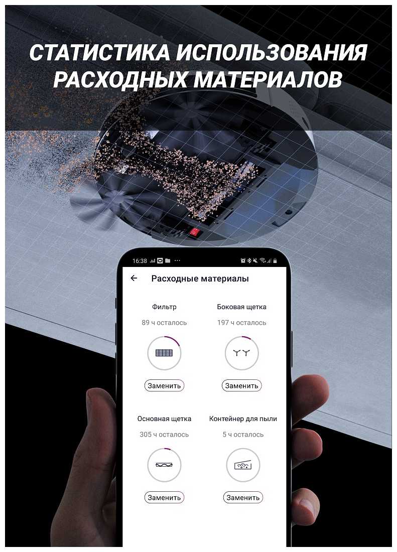 - В приложении доступны: настройка зон уборки, отслеживание расхода фильтров, история очистки.