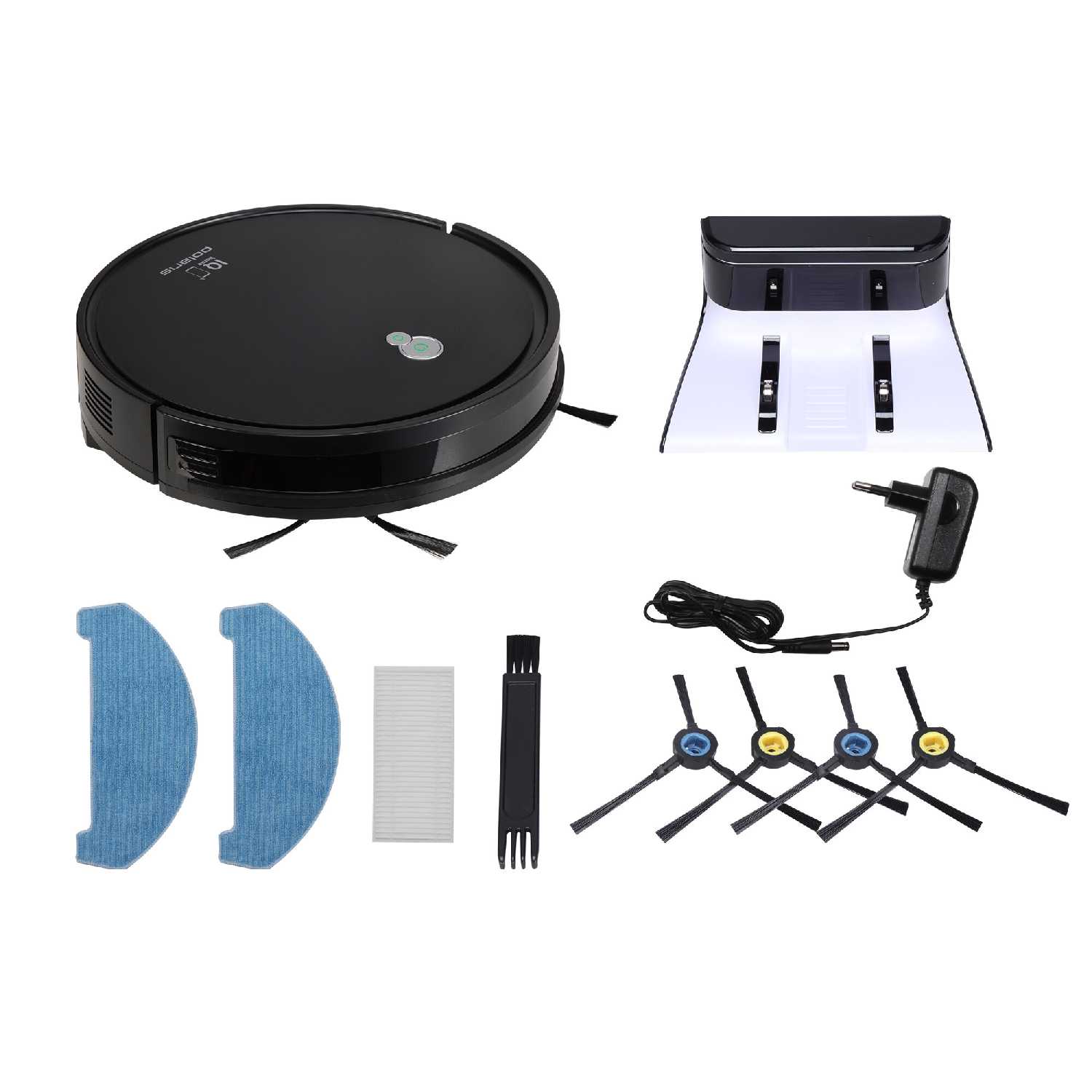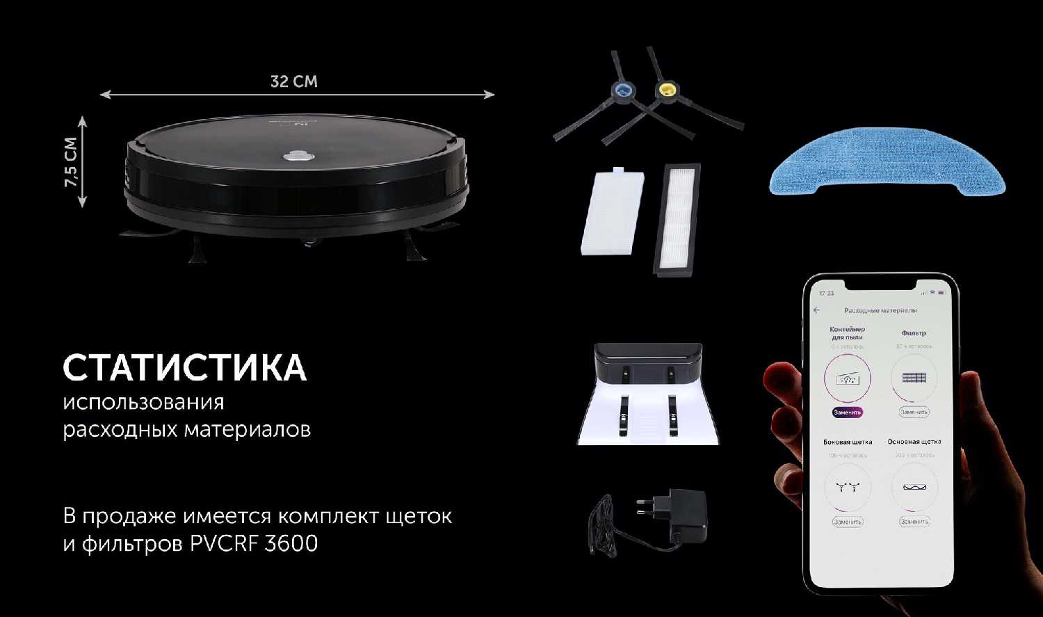 - Включает запасные фильтры, щетки, тряпки и батарейки для пульта.