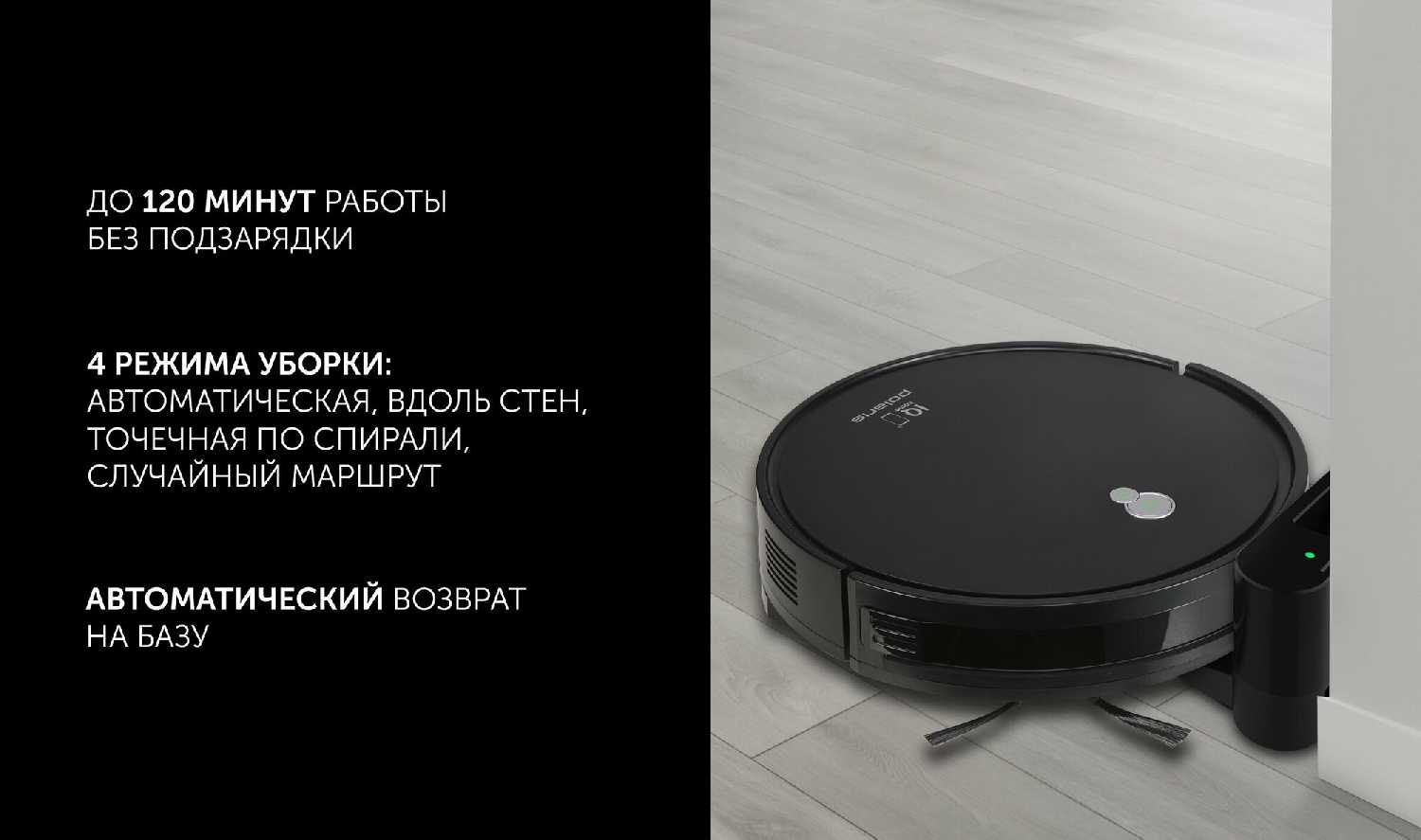 - Автоматически возвращается на базу после уборки или разряда.