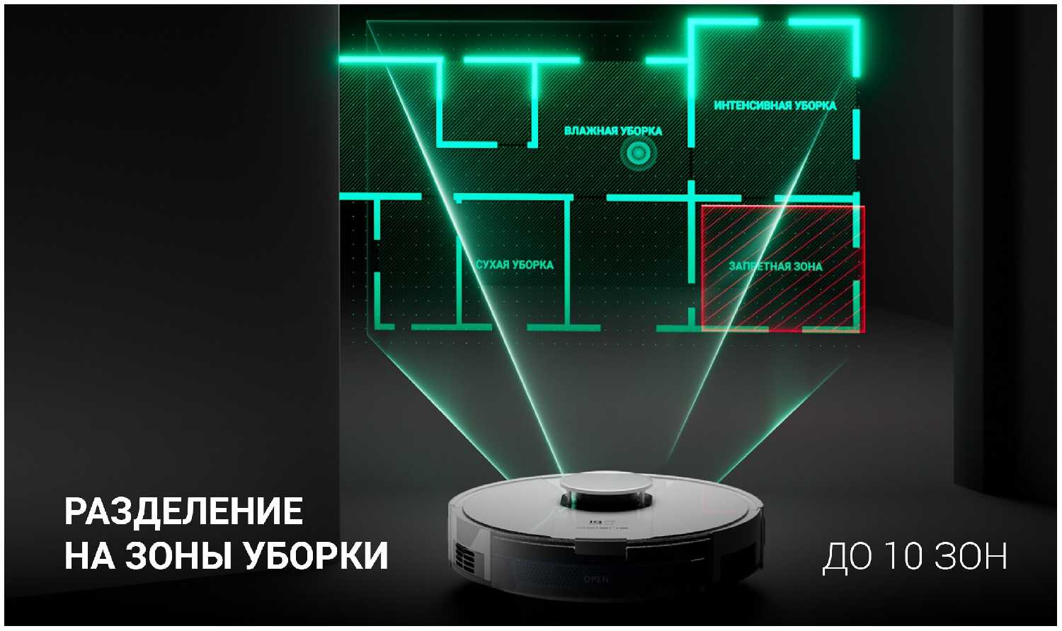 - Возможность настройки виртуальных стен и зон уборки с точностью до 10 см.