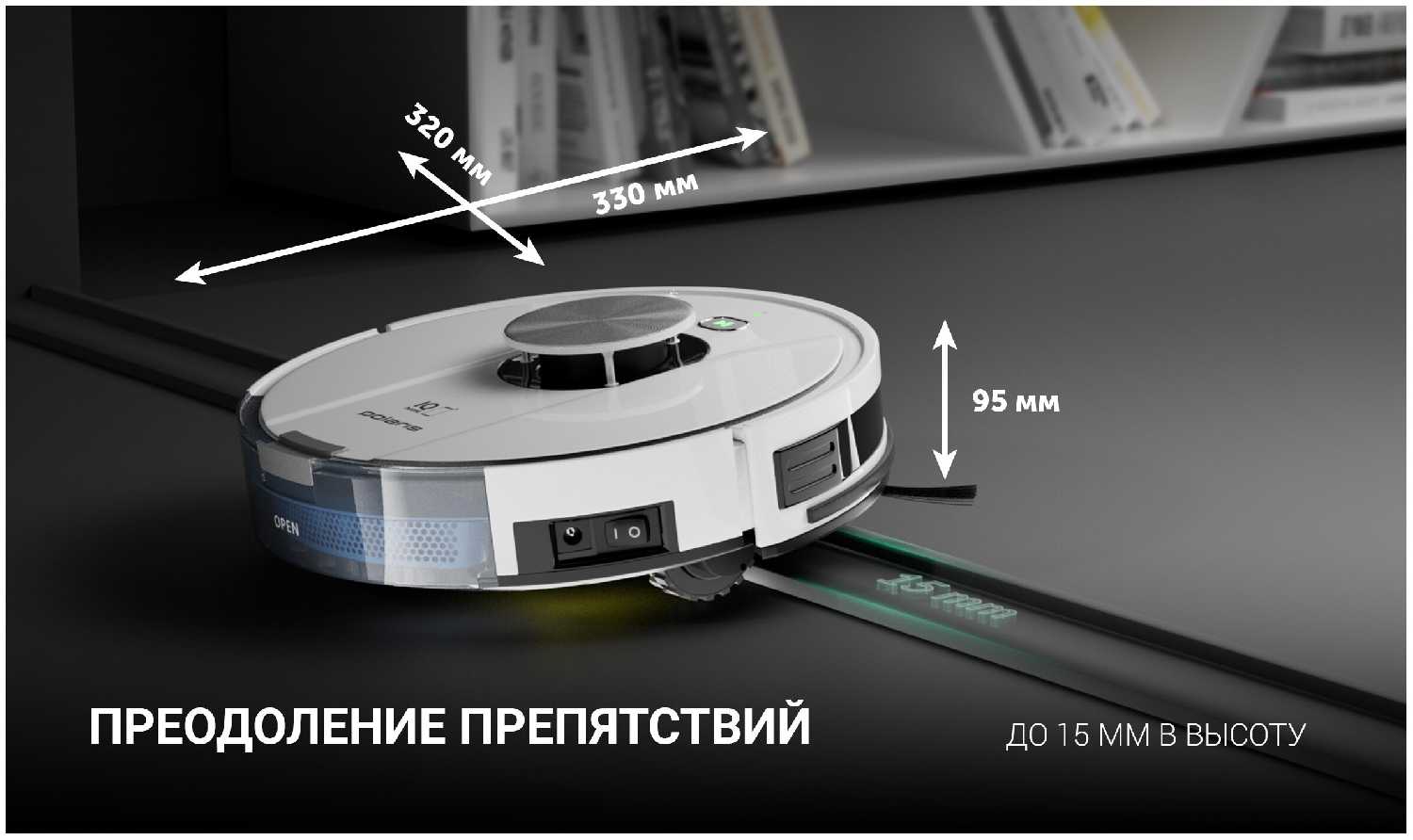 - Преодолевает пороги до 2 см и заезжает под низкую мебель (диваны, кухонные гарнитуры).