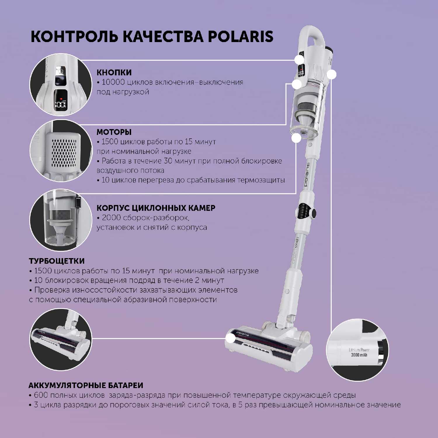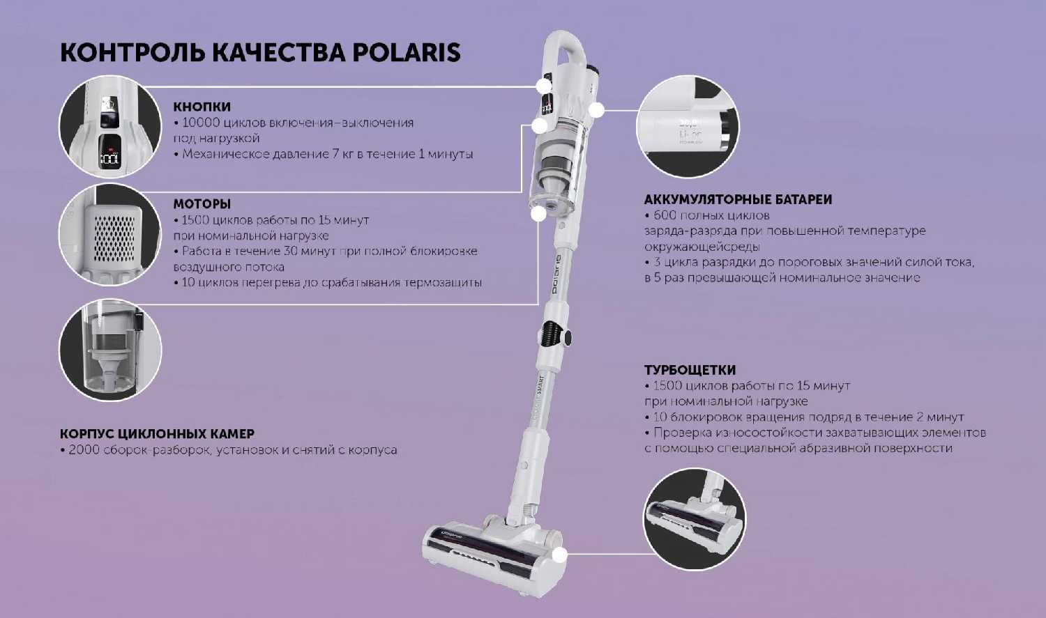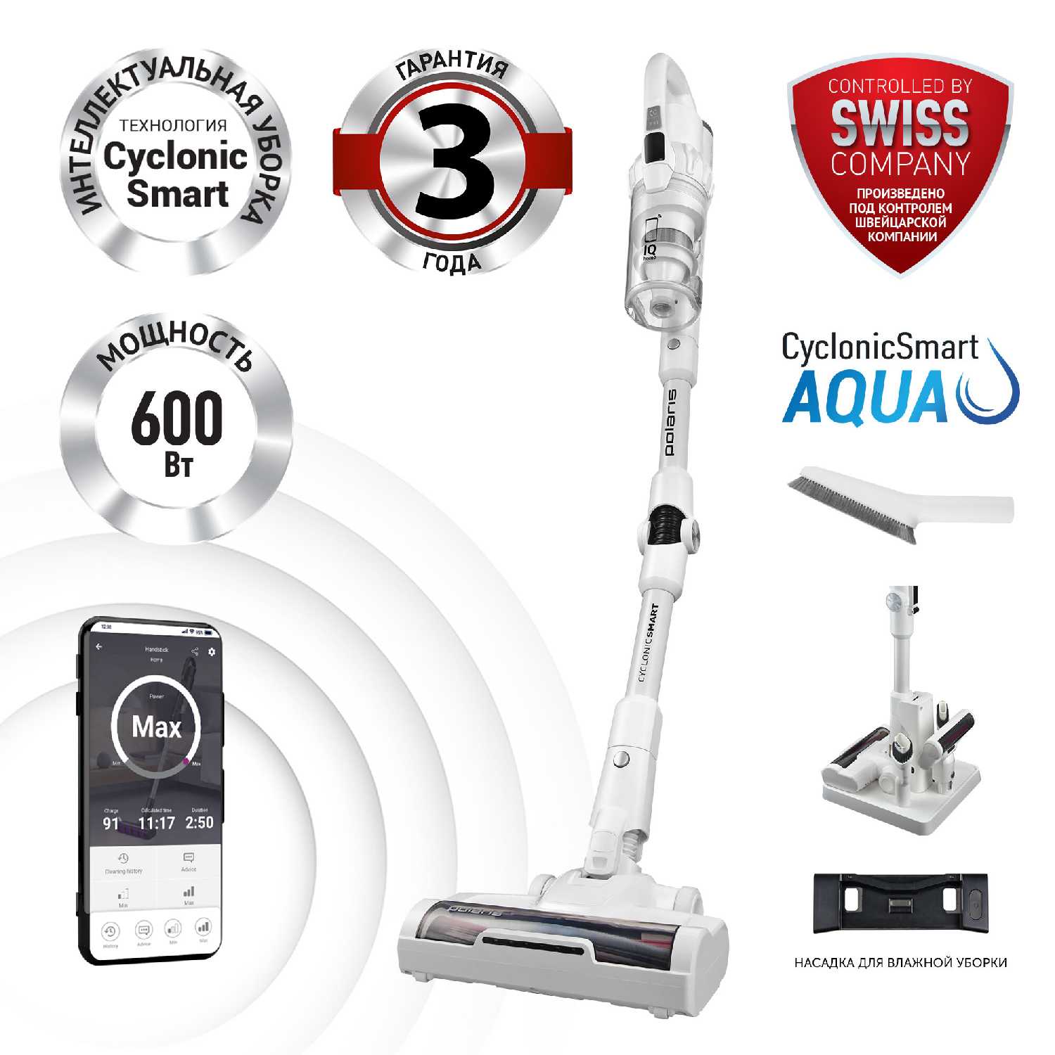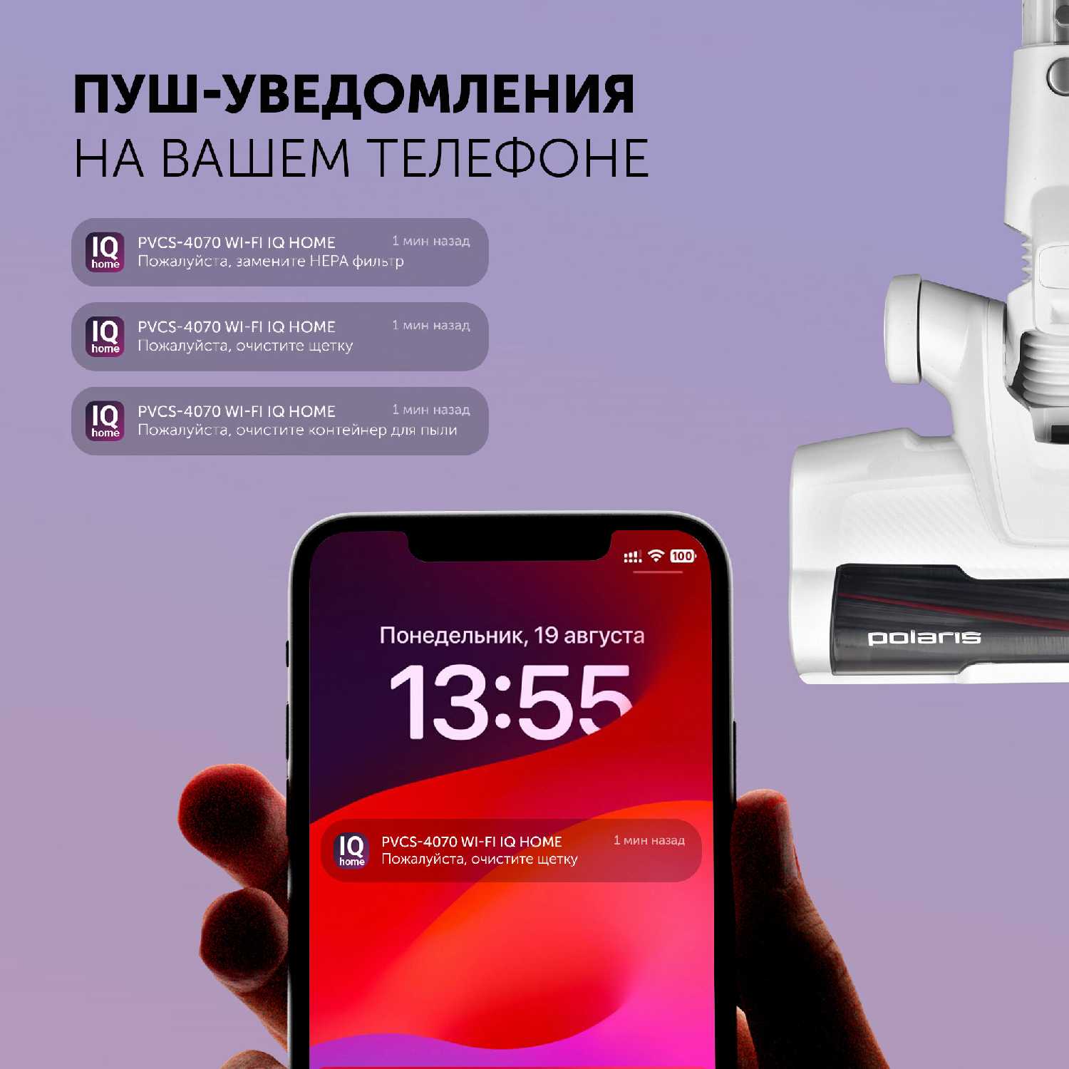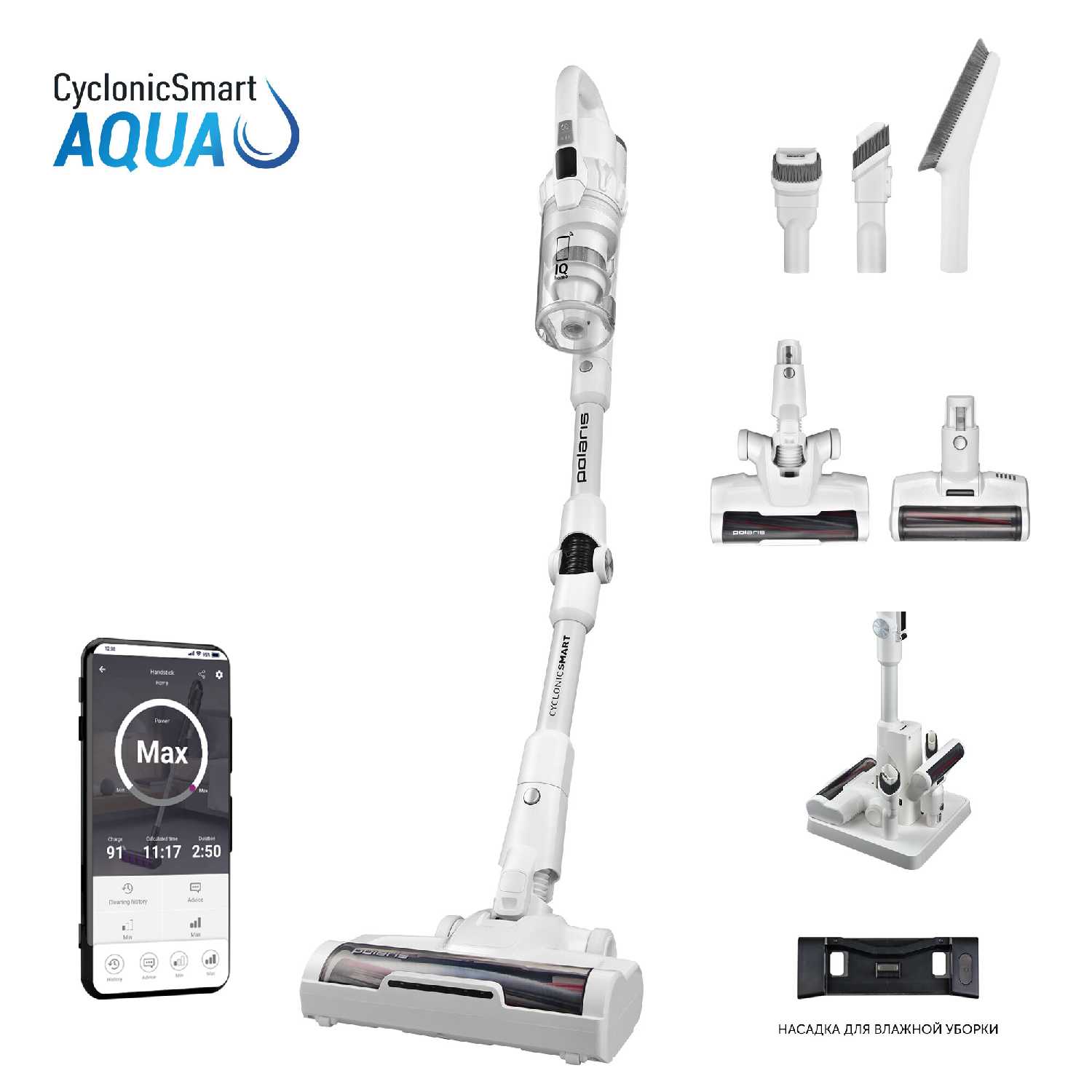 - Синхронизация с приложением Polaris через Wi-Fi: мониторинг заряда, срок замены фильтров, история уборки.