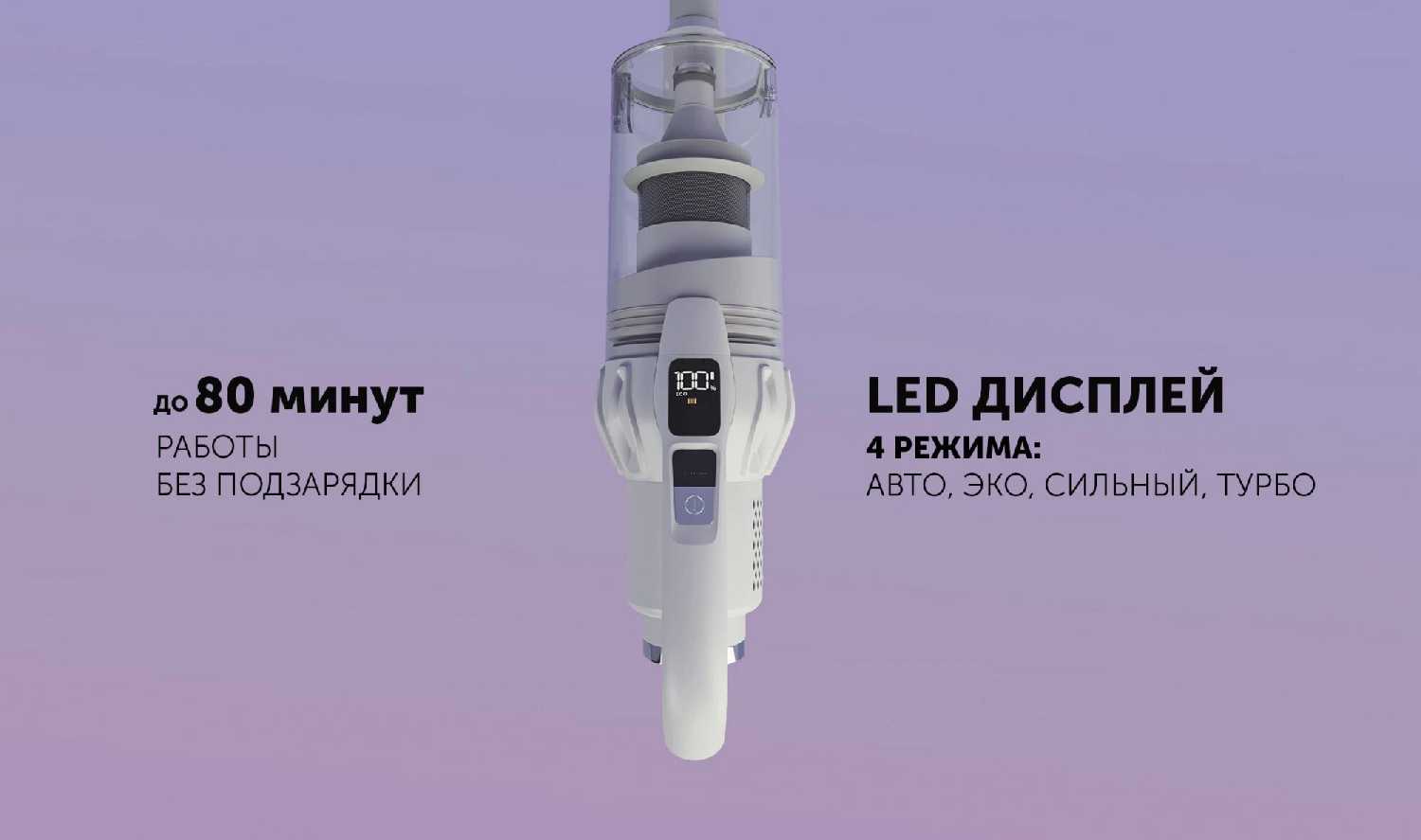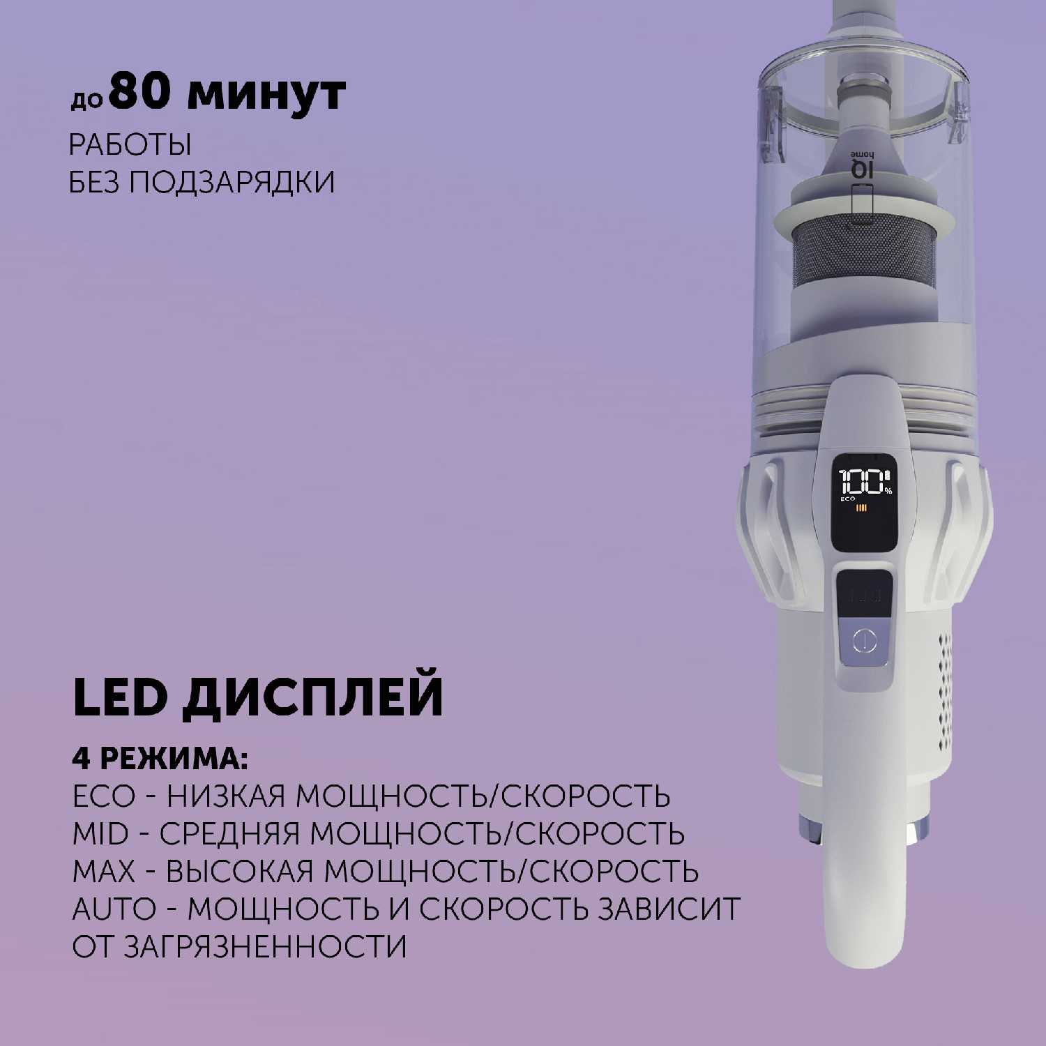 - Сенсорный дисплей на ручке отображает уровень заряда, ошибки (засорение фильтра) и режимы работы.