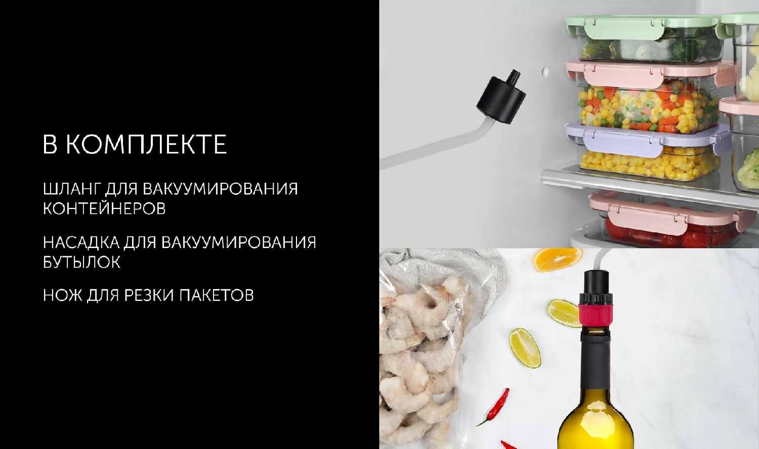 - Шланг с насадкой откачивает воздух из специальных контейнеров, продлевая свежесть салатов или остатков еды в холодильнике на несколько дней.