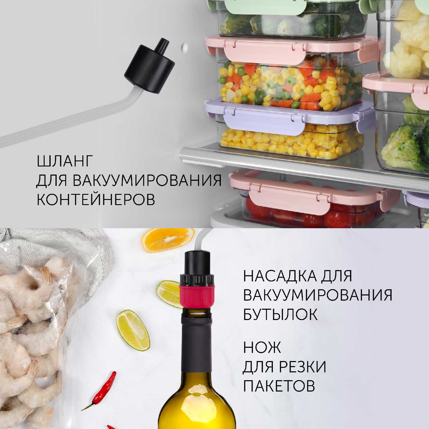 В комплекте имеется специальная трубка для вакуумирования контейнеров и пробка для бутылок, что расширяет функциональные возможности прибора. Пользователи успешно вакуумируют напитки в бутылках, включая вино и свежевыжатые соки, которые сохраняют свежесть до двух недель в холодильнике. Также устройство позволяет герметично упаковывать продукты в специальные вакуумные контейнеры, что особенно удобно для хранения готовых блюд и остатков пищи. -