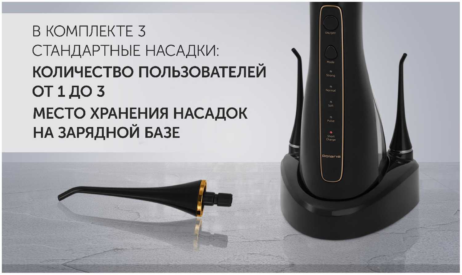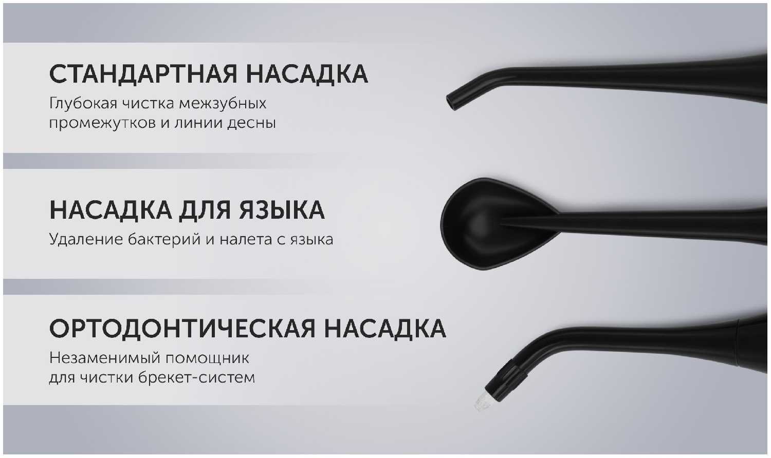 ✔ 4 насадки в комплекте – стандартная, для брекетов, для языка и пародонтологическая. Очень удобно для семьи.