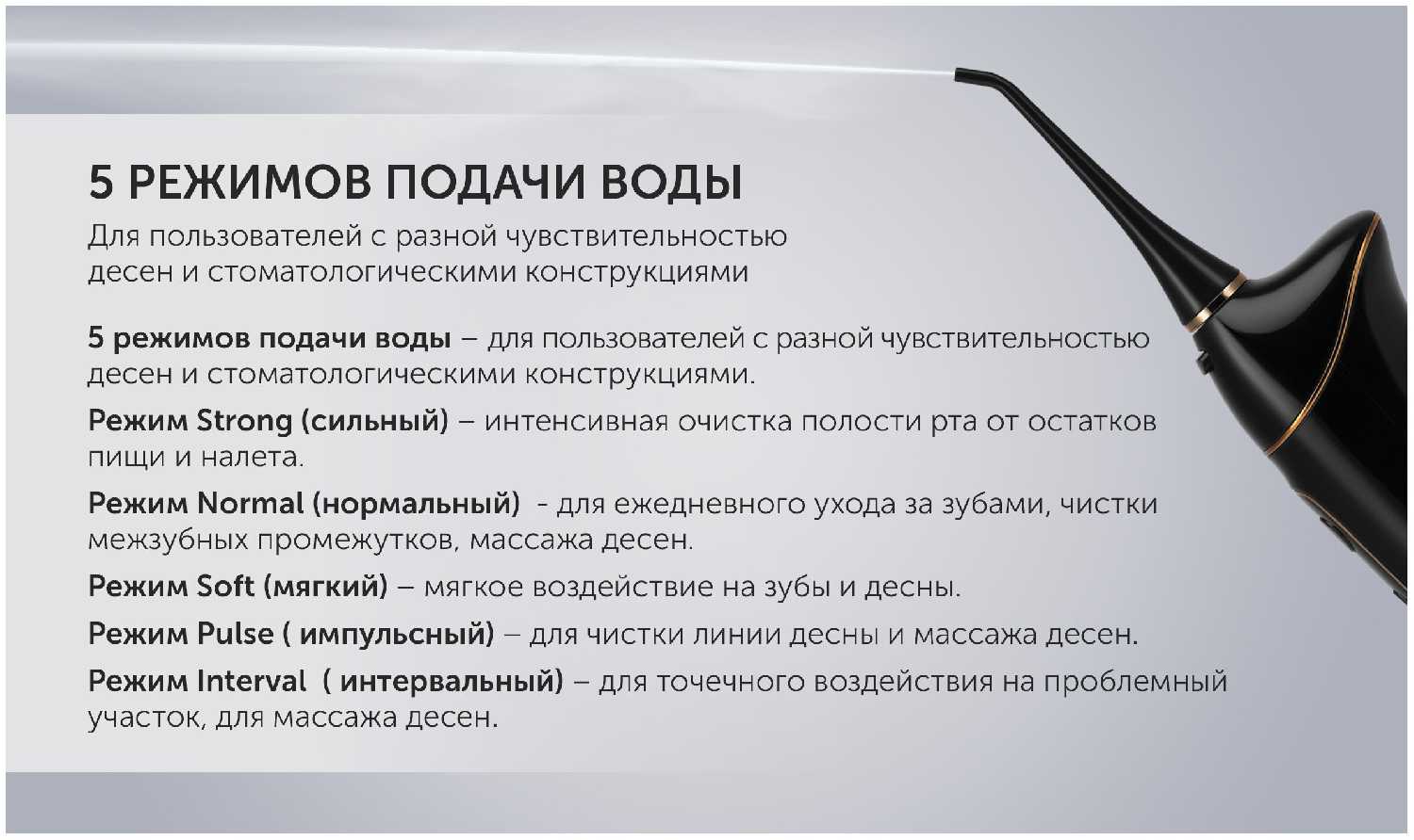 ✔ 10 уровней давления воды – можно настроить от мягкого до интенсивного режима (подходит и для чувствительных десен, и для тщательной очистки).