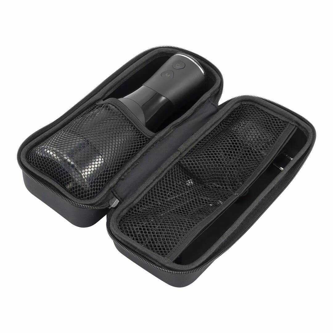 Ручка фиксируется на корпусе мощным магнитом, исключая падения, а шланг спирально наматывается в специальное углубление. Насадки хранятся в бархатном футляре с ячейками. Габариты (10 см шириной) позволяют размещать его на ограниченном пространстве, а прорезиненные ножки предотвращают скольжение. -