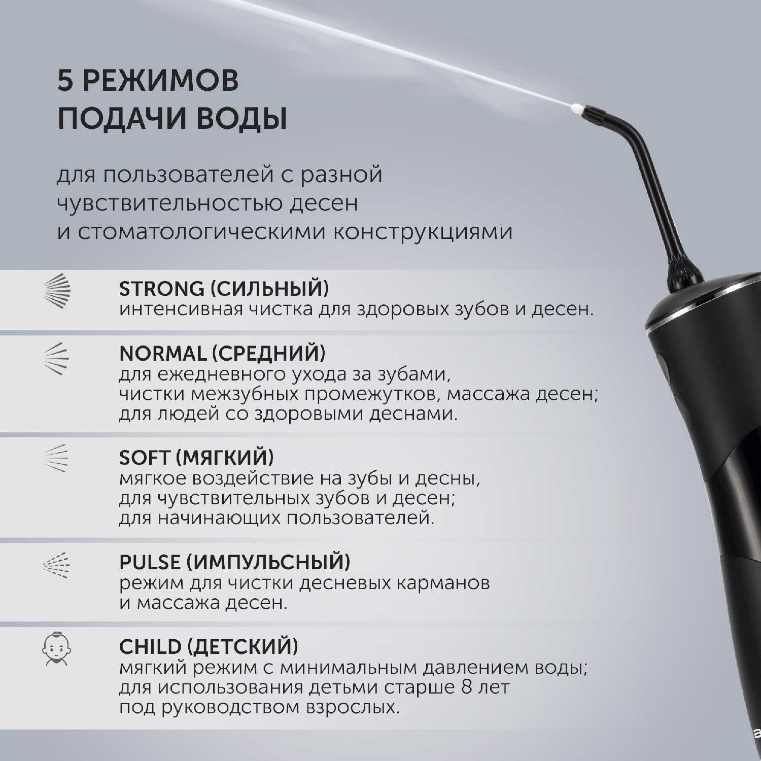 Ирригатор оснащён 5 ступенями давления воды, переключаемыми на ручке. Владельцы с чувствительными дёснами (особенно при пародонтите) используют минимальные режимы, тогда как для очистки мостов и брекетов рекомендуются уровни 3-5. Три режима пульсации (чистка/массаж/гигиена) позволяют адаптировать процесс: массажный режим мягко стимулирует дёсны, а гигиенический интенсивно обрабатывает проблемные зоны. -