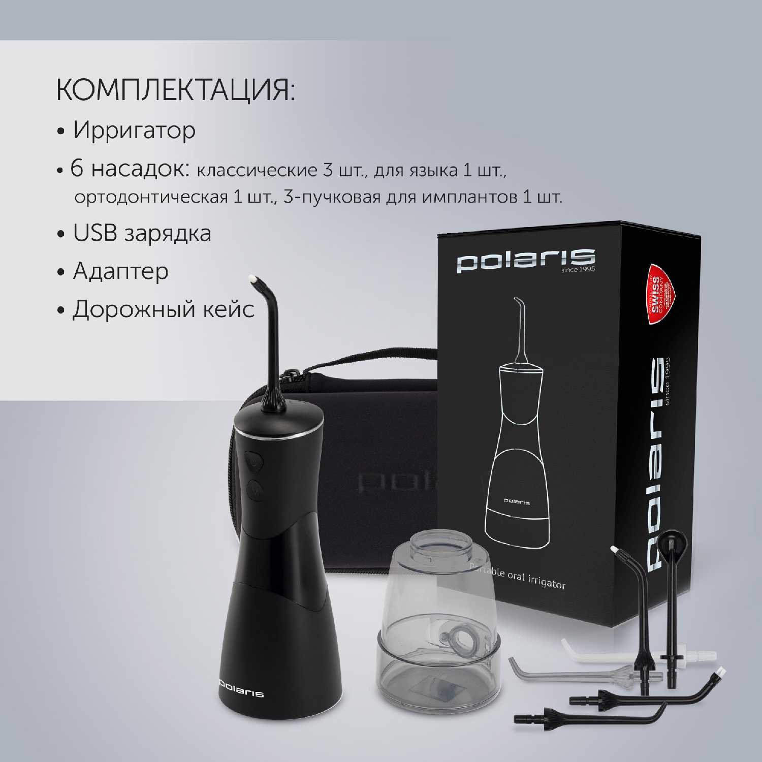 Здравствуйте! Приобрела ирригатор Polaris PWF 2001 W белого цвета. Ирригатор хорошо упакован в белой красивой коробке. В комплекте есть 7 насадок, дорожный футляр для транспортировки насадок, адаптер, упакованые в индивидуальные пакеты, подробное руководство на русском языке. Ирригатор имеет компактный размер, стильный, объем резервуара для воды 600 мл. Есть 3 режима работы: чистка, массаж, гигиена. Ирригатор сам выключается через 3 минуты работы. Ручка ирригатора крепится к корпусу на магните, что очень удобно, шланг накручивать спирально. После применения ирригатора ощущается чистота и свежесть, прекрасно ощищает межзубное пространство от остатков еды, с чем не справляется зубная щётка. Рекомендую к покупке данную модель ирригатора.
