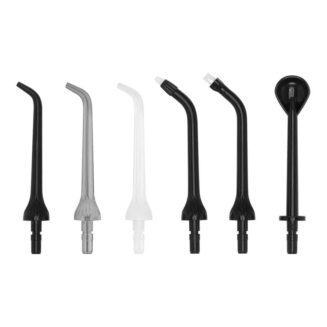 Комплектация из семи насадок (4 стандартные с цветными кольцами для идентификации пользователей, ортодонтическая, пародонтологическая и для языка) определила главное преимущество модели — возможность семейного использования без докупки аксессуаров. Это делает прибор идеальным решением для домохозяйств, где одновременно нужен уход за естественными зубами, брекет-системами, коронками или имплантами. Насадка для языка эффективно освежает дыхание, а пародонтологическая насадка позволяет бережно очищать области вокруг мостов. Пользователи также экспериментируют с наполнением резервуара — помимо воды, применяют отвары ромашки или ополаскиватели для усиления антибактериального эффекта.
