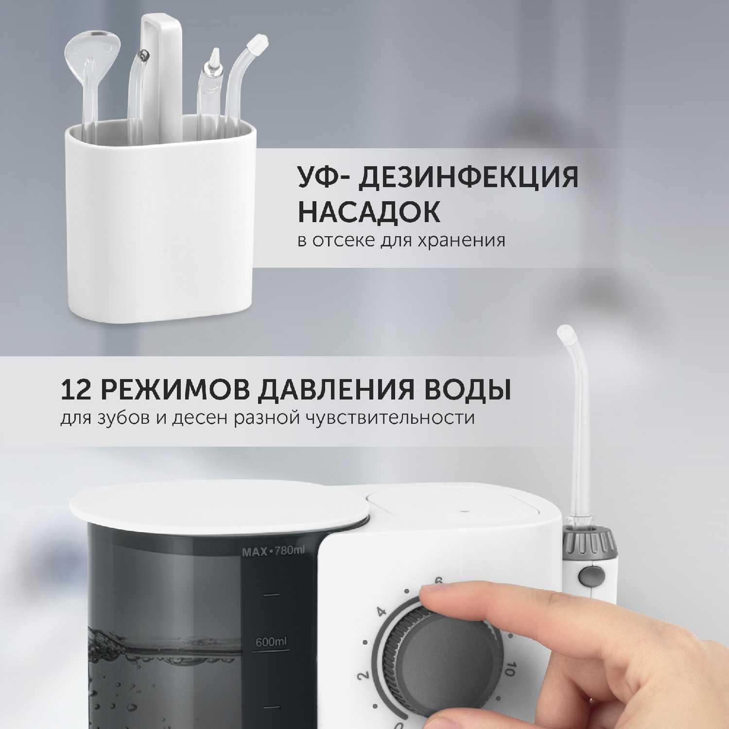 - 12 градаций давления воды позволяют адаптировать напор под чувствительность десен (пользователи отмечают комфорт на 5-7 уровнях).