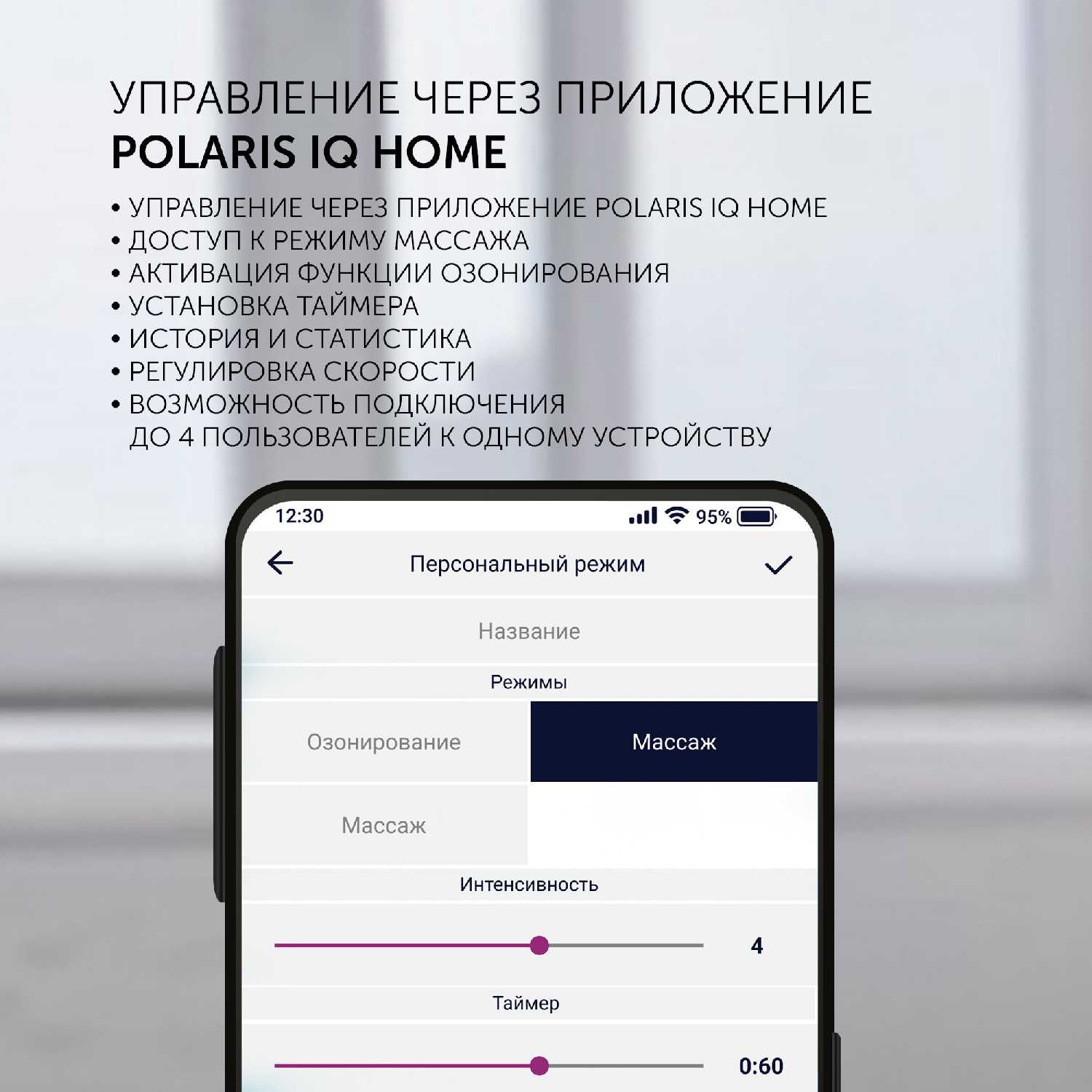 - Некоторые расширенные функции, такие как детальная настройка массажного режима, доступны только через мобильное приложение, а не с панели управления на корпусе.