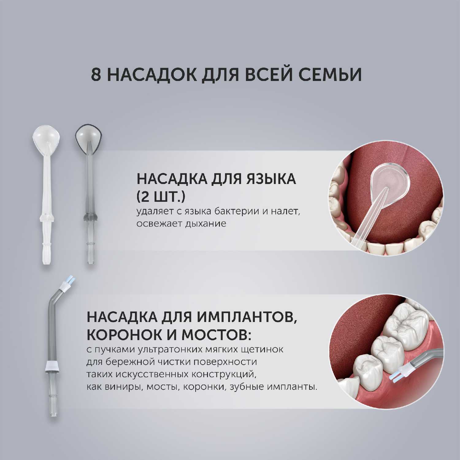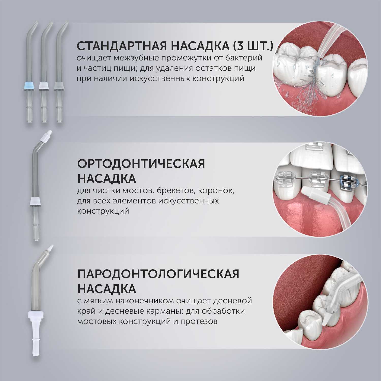 - Аккуратная и эффективная очистка области вокруг имплантов, коронок, мостов и брекетов без их повреждения делает устройство незаменимым для людей с ортодонтическими конструкциями.