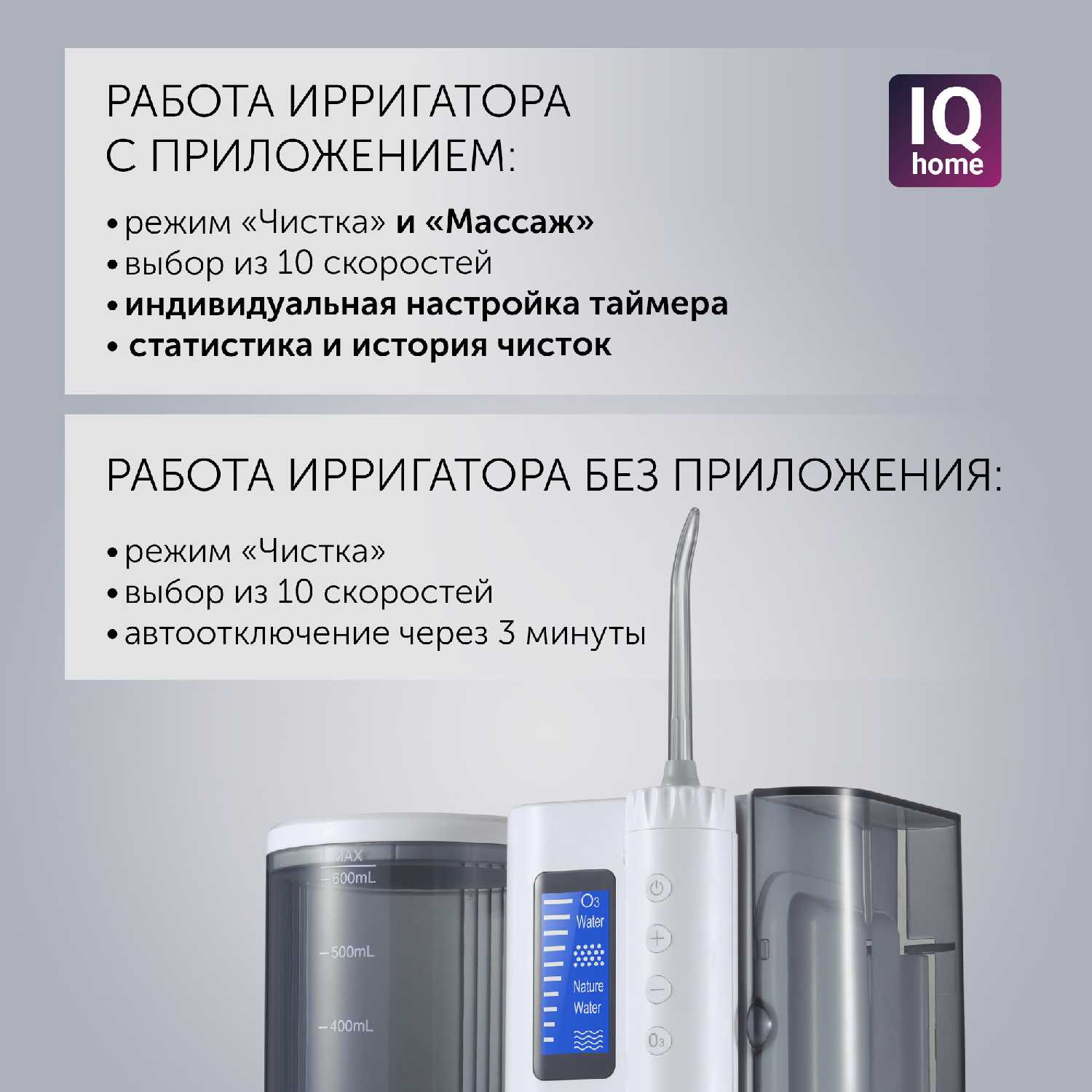 Ирригатор оснащен прогрессивной системой регулировки давления воды, предлагающей 10 отдельных режимов. Это позволяет каждому пользователю индивидуально подобрать интенсивность, от очень мягкой до мощной, полностью исключая дискомфорт или травмирование десен. Люди с повышенной чувствительностью, а также те, кто ухаживает за имплантами или коронками, отмечают комфортность использования при правильно подобранном режиме. -