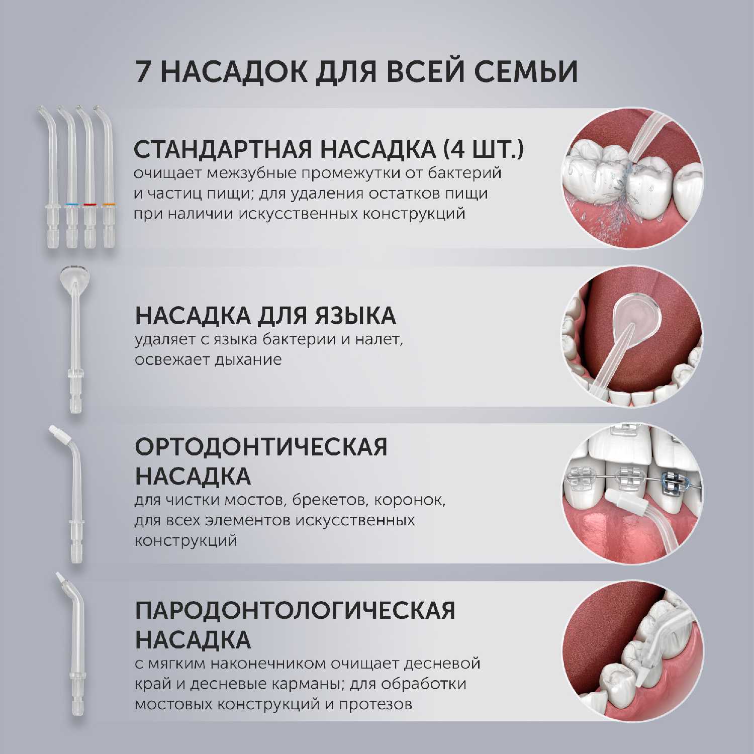 - В комплект входит семь насадок: четыре стандартных (с цветными кольцами для различения пользователей), ортодонтическая, пародонтологическая и насадка для очистки языка, что покрывает все основные потребности в гигиене.