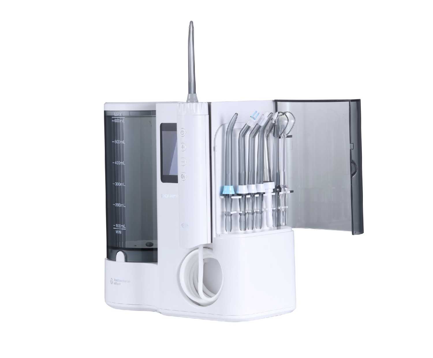 Производитель продумал систему хранения: все 7 насадок размещаются в специальном отсеке-дверце на корпусе устройства, где они фиксируются и не теряются. Сама ручка с длинным гибким шлангом надежно крепится к корпусу с помощью магнита. Провод питания также убирается в корпус. Такая компоновка делает прибор компактным и эргономичным, он занимает минимум места на полке в ванной комнате. -