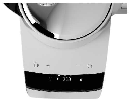 Чайник оснащён сенсорным дисплеем управления, звуковым сигналом. А также на чайнике имеется шкала контроля воды, которая светится при включенном приборе.