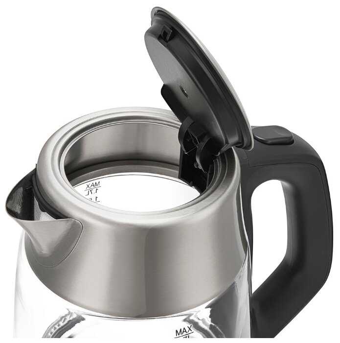 - Ручка из мягкого термостойкого пластика не скользит, а крышка открывается на 90°, упрощая залив воды.