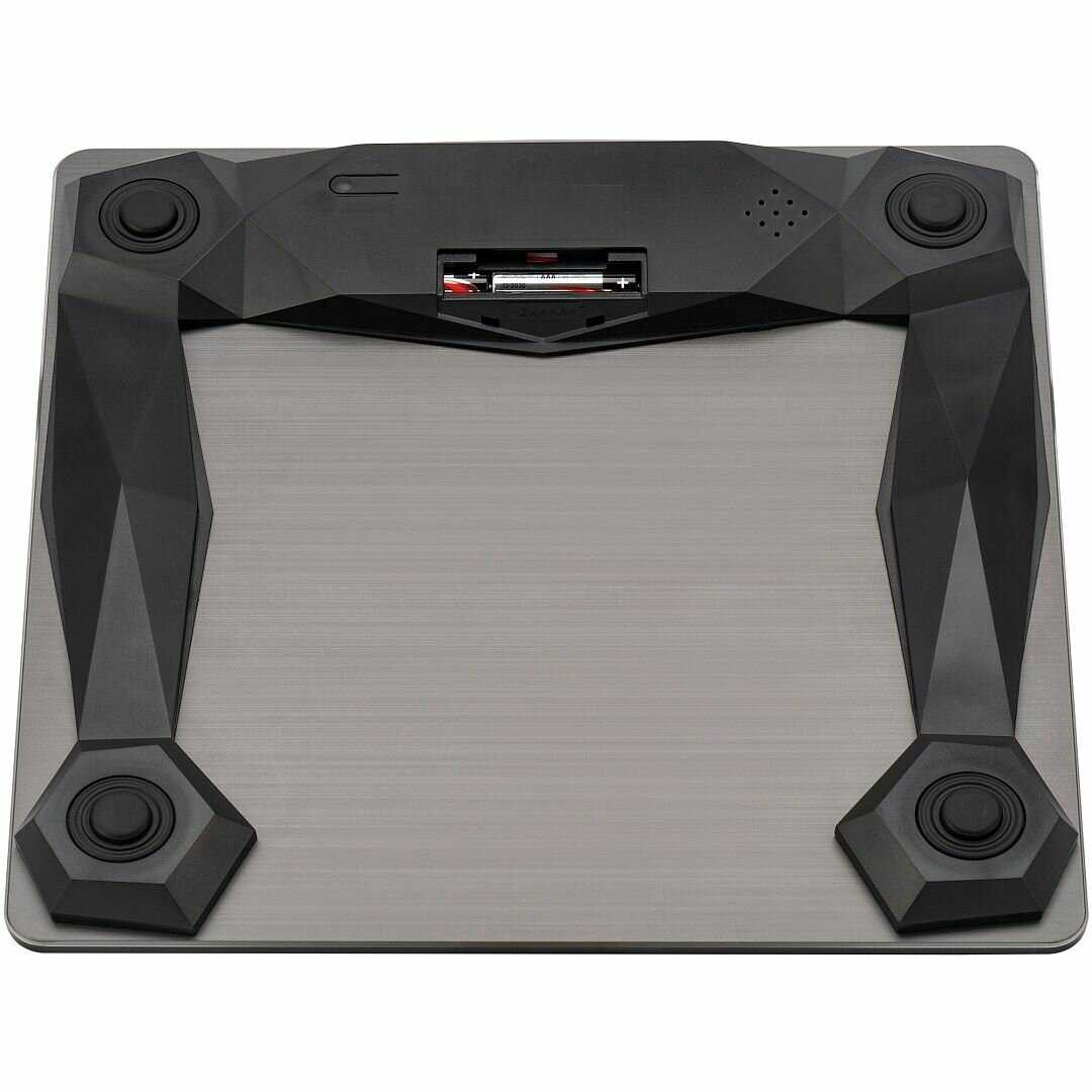 Стеклянная поверхность в цвете «мокрый асфальт» устойчива к царапинам, но оставляет следы от босых ног. В комплекте есть микрофибровая салфетка для очистки. Габариты 30x30x2.5 см позволяют размещать весы даже в маленькой ванной, а вес 1.8 кг предотвращает смещение. -