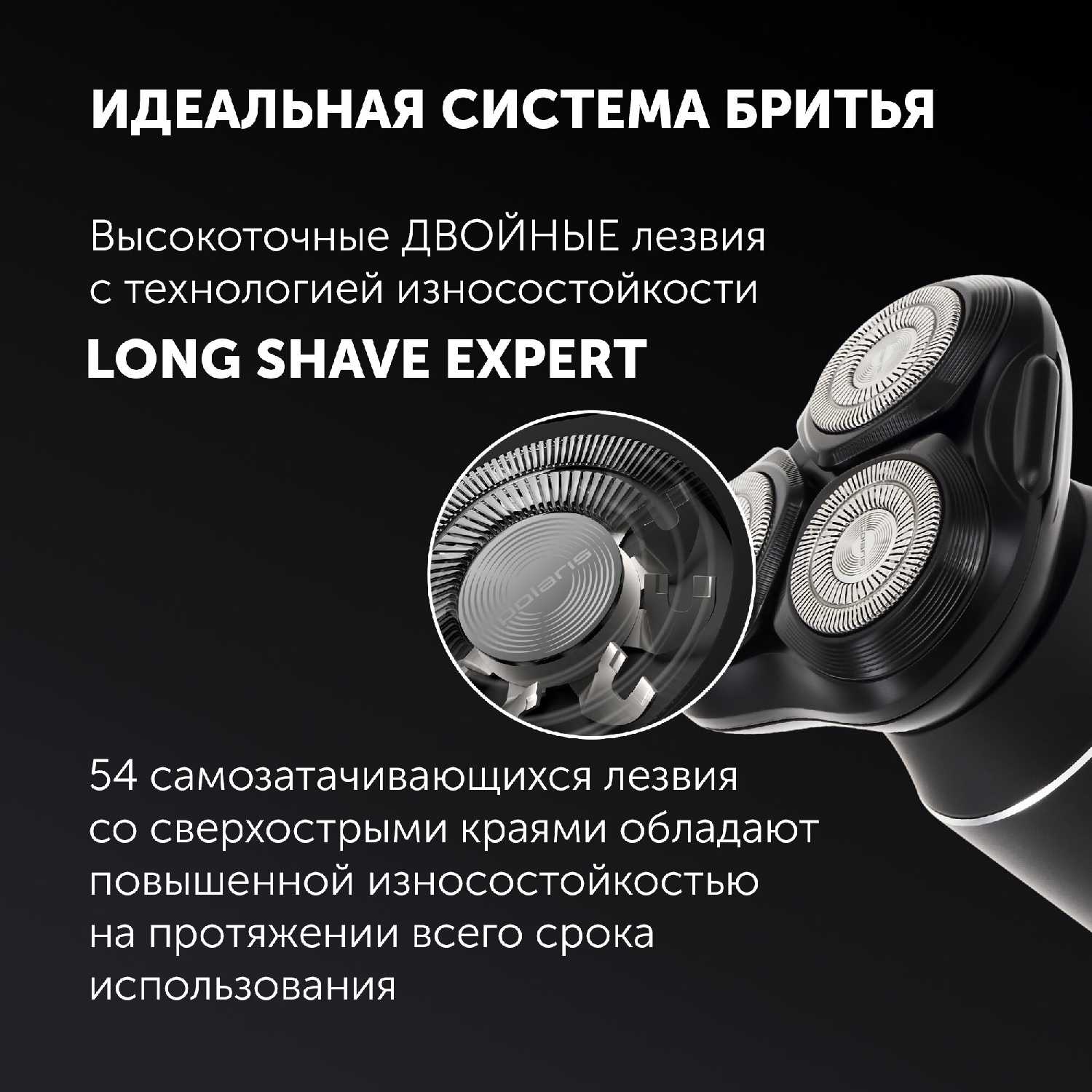 - Плавающие роторные головки с двойными лезвиями плавно повторяют изгибы кожи, обеспечивая чистое сбривание без пропусков.