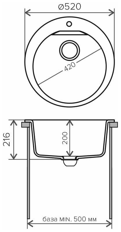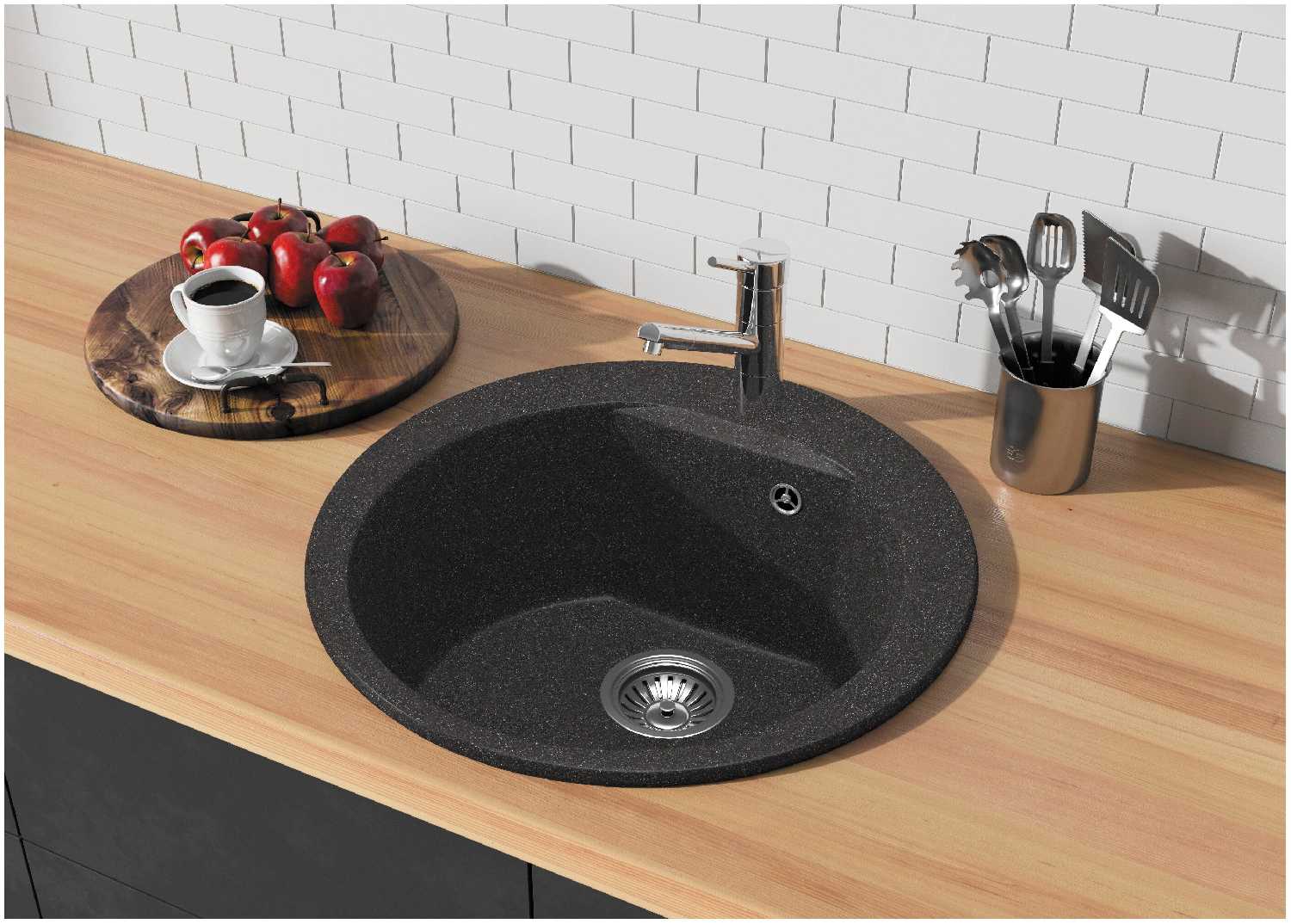 Круглая мойка здорово смотрится на маленькой, практически игрушечной кухне. По сути она занимает столько же места, сколько и квадратная, но из-за своей формы визуально кажется все же меньше. Поэтому владельцам маленьких кухонь советую. Крыльев у нее нет, выступающие края совсем тонкие, поэтому гель для мытья посуды и все губки придется хранить на столешнице, если подобрать для них специальный маленький подносик, будет прекрасный вид. Еще мойка хороша тем, что совместима с большим количеством разных смесителей, отверстие под него универсальное.