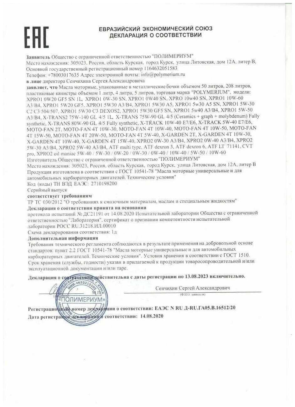 Отзывы о Моторное синтетическое масло POLYMERIUM XPRO1 0W-30 SN A3/B4, всесезонное