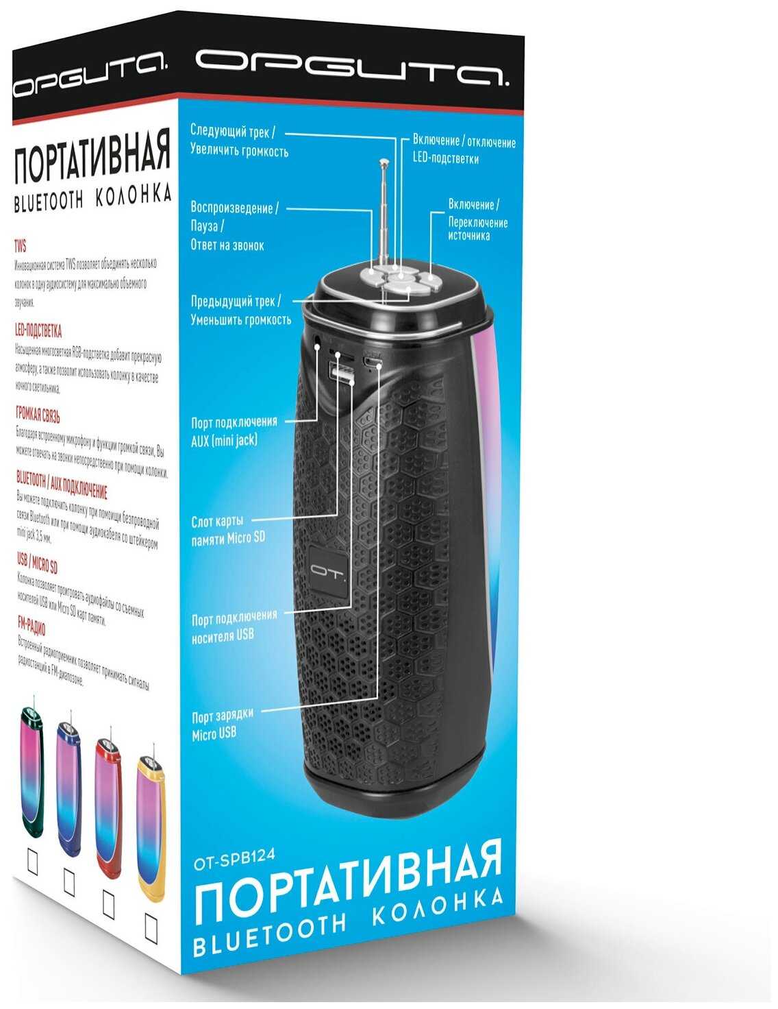 4.9/10 балловОрбита Колонка Bluetooth 5.0, LED подсветка, FM радио, USB плеер - беспроводная блютуз колонка OT-SPB124