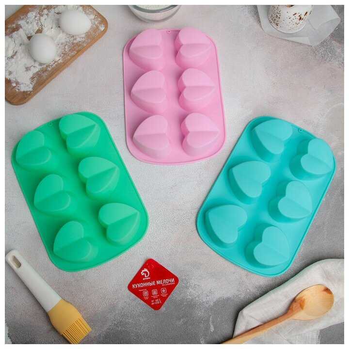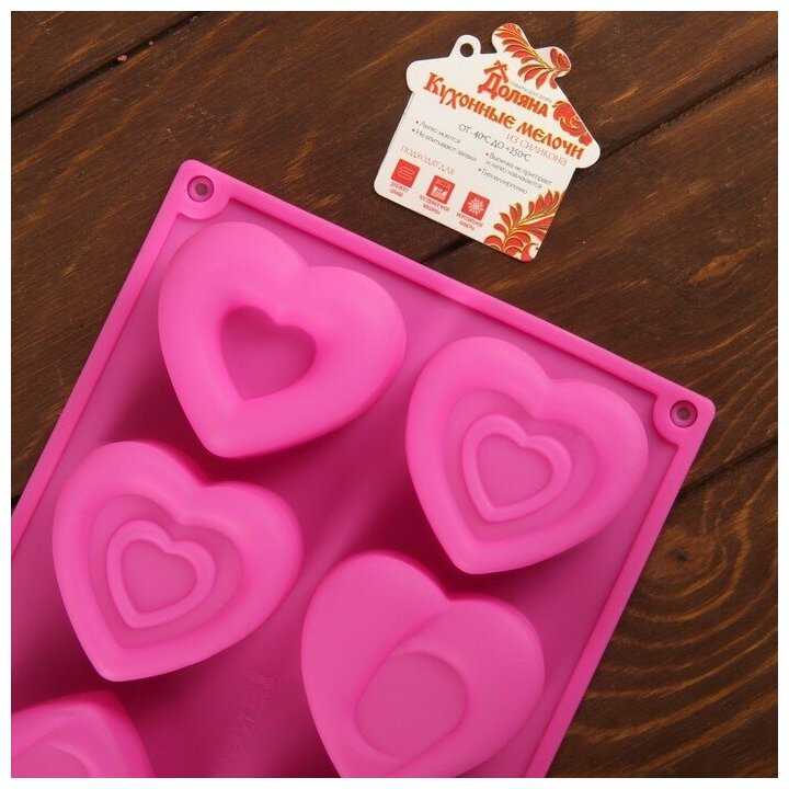 Доляна Форма силиконовая для выпечки, запекания кексов, печенья, десертов, посуда для духовки, 6 ячеек "Сердце пополам" 24x16,7x3 см (7х6,5х3 см) цвет микс