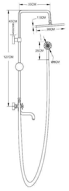 | Дополнительная информация : | высота стойки для душа: 1270 мм, диаметр душевой лейки: 80 мм, диаметр верхнего душа: 200 мм |