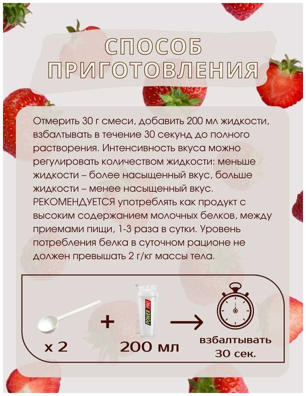 | Дополнительная информация : | Пищевая ценность в 30 г (порция): Энергетическая ценность 113 ккал Белки 20 г Жиры 1, 5 г Углеводы 4, 2 г Пищевые волокна 1, 5 г Бромелайн 0, 3 г Ингредиенты: концентрат сывороточного белка, растворимые волокна кукурузы, сублимированная клубника, натуральный ароматизатор, экстракт ананаса (бромелайн), подсластитель — сукралоза, натуральный краситель – кармин. |