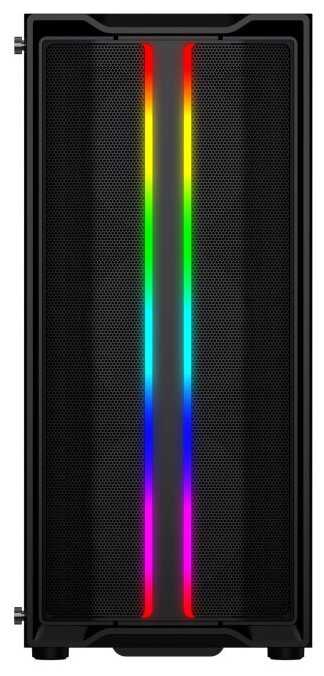 Подсветка включает светодиодную полосу на передней панели и ARGB-вентилятор на выдуве, работающие через встроенный контроллер с кнопкой переключения режимов на корпусе. Доступны статичное свечение, плавные цветовые переходы и динамические эффекты типа "бегущих огней". Для синхронизации с материнской платой предусмотрен 3-pin разъём, хотя некоторые отмечают ступенчатое переключение цветов. Три фронтальных вентилятора не имеют подсветки, но свет от передней панели создаёт иллюзию их свечения. -