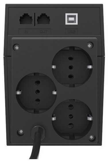 Первый тест показал: спокойно выдержал отключение от электросети компьютера на 5 мин, притом емкость батареи была на уровне 60% по окончании теста. Наличие трех евророзеток, что вполне стандартно. И плюс разъем для усб-проводки для подключения к компьютеру. Кстати, есть защита телефонной линии, но мне это без надобности, да и не знаю, как это сделать