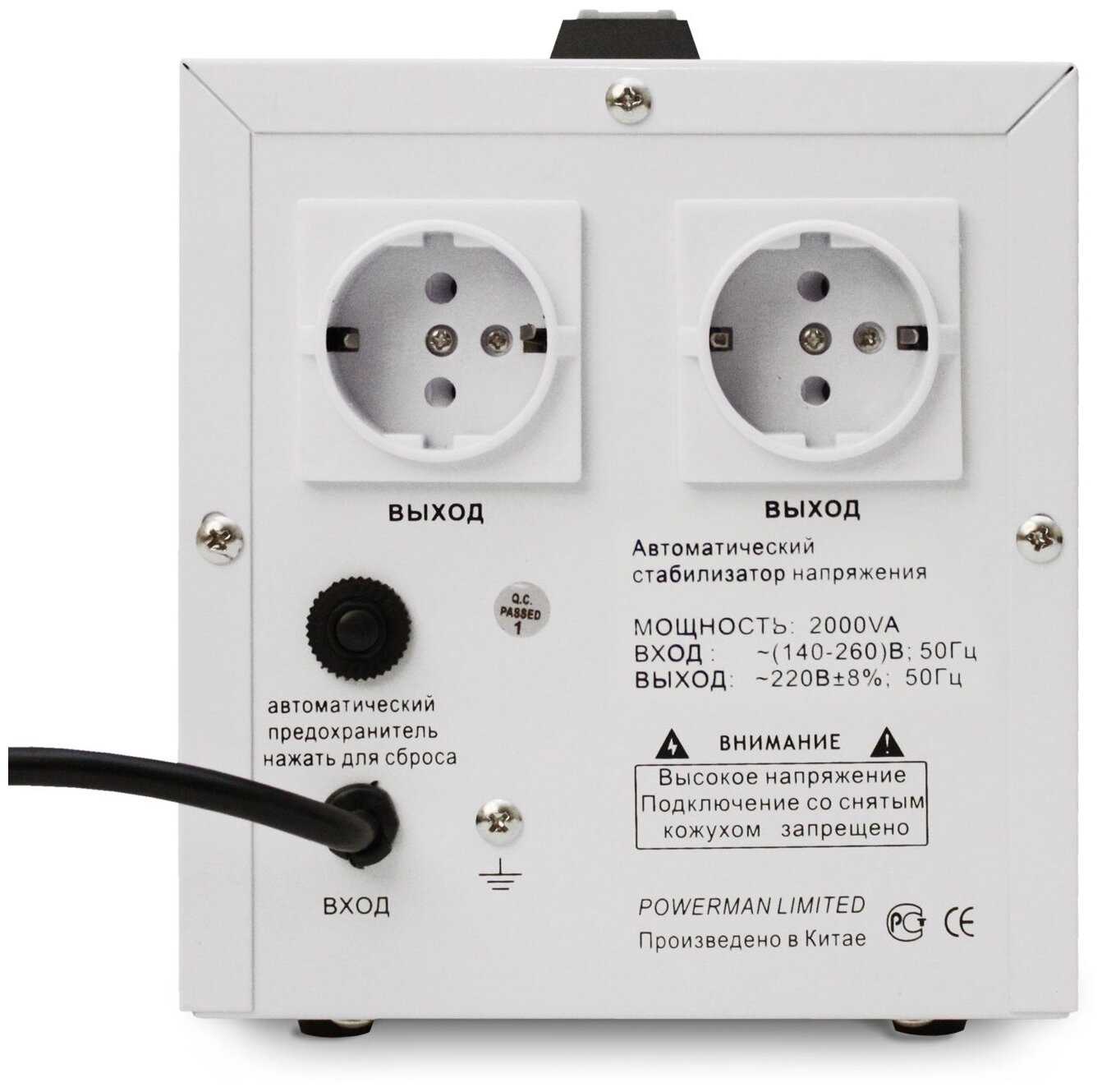 Цена приемлемая за 1.5 квт. Защита от короткого замыкания, от повышенного напряжения, от перегрева, предохранитель (термопрерыватель). Диапазон от 140 (для дачников (СНТ, СПК, ТСН)) до 260В. Две розетки вообще редкость.
