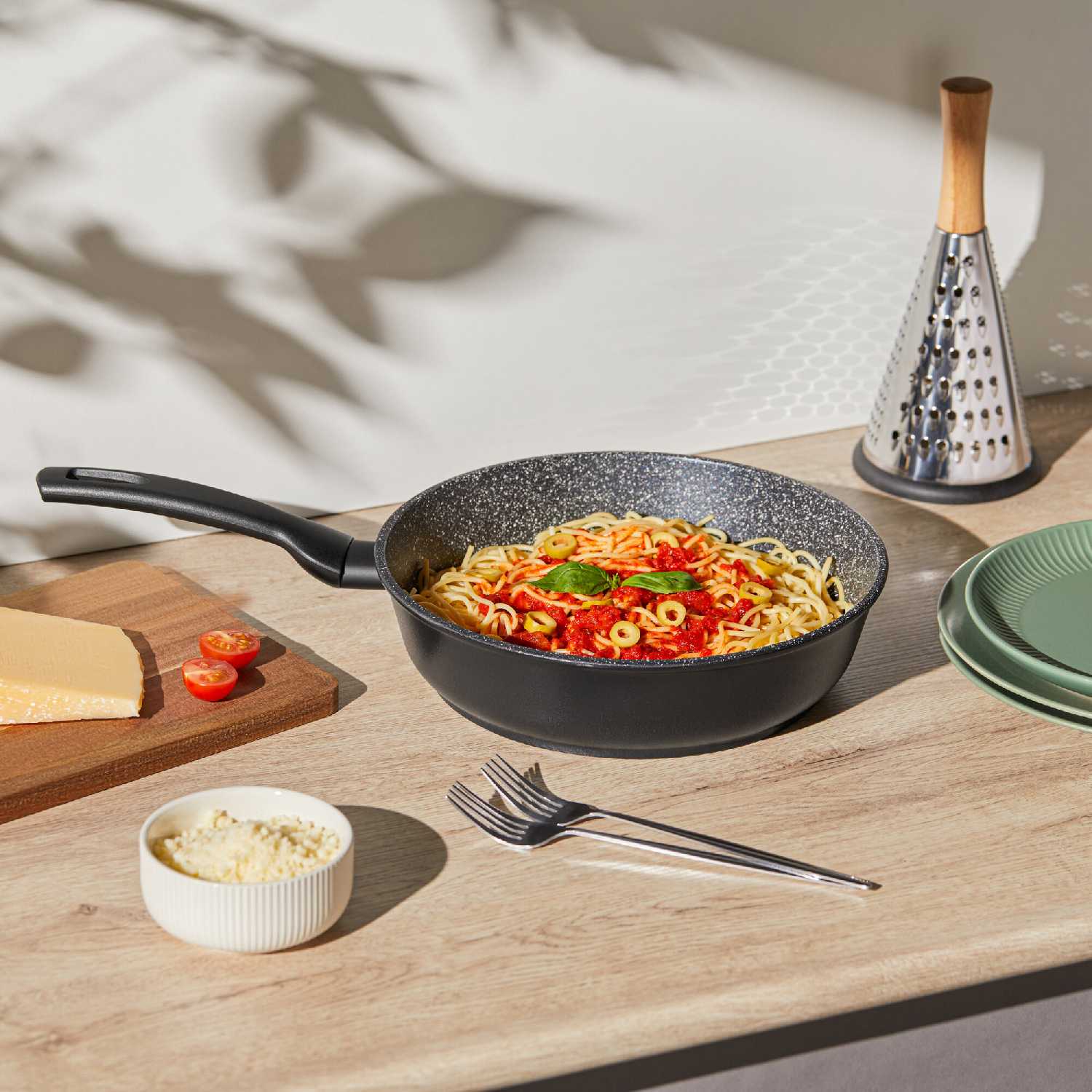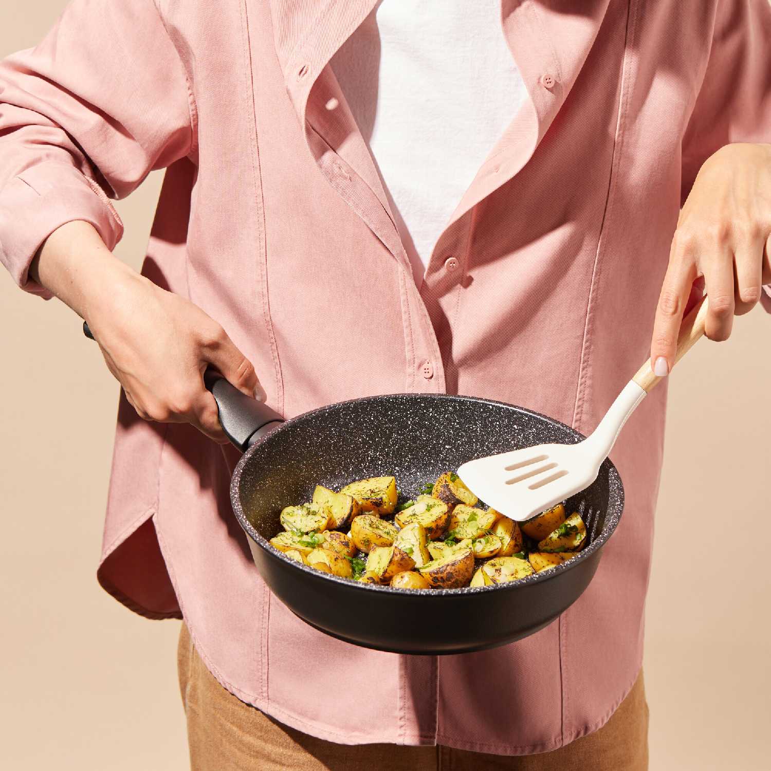 Высокие, почти вертикальные бортики — одна из самых хвалебных особенностей. Они эффективно предотвращают разбрызгивание масла и жира, что делает готовку чище. Кроме того, такая форма значительно удобнее для помешивания и переворачивания продуктов, а также идеально подходит для тушения блюд с соусами, где нужен достаточный объем. -