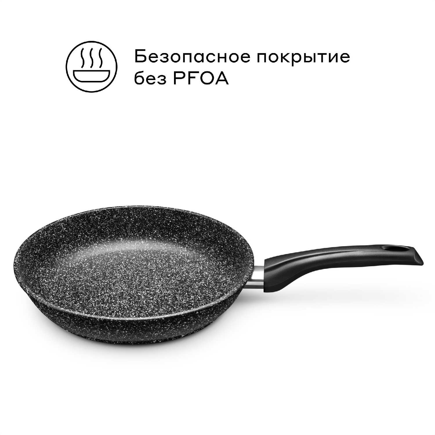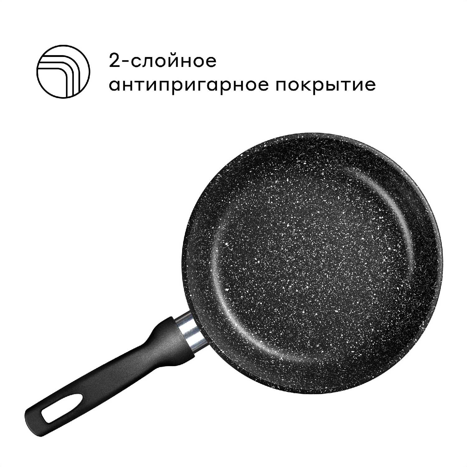 - Покрытие гранитного типа предотвращает прилипание продуктов, как блины или яйца, что упрощает приготовление здоровых блюд с минимальным жиром.