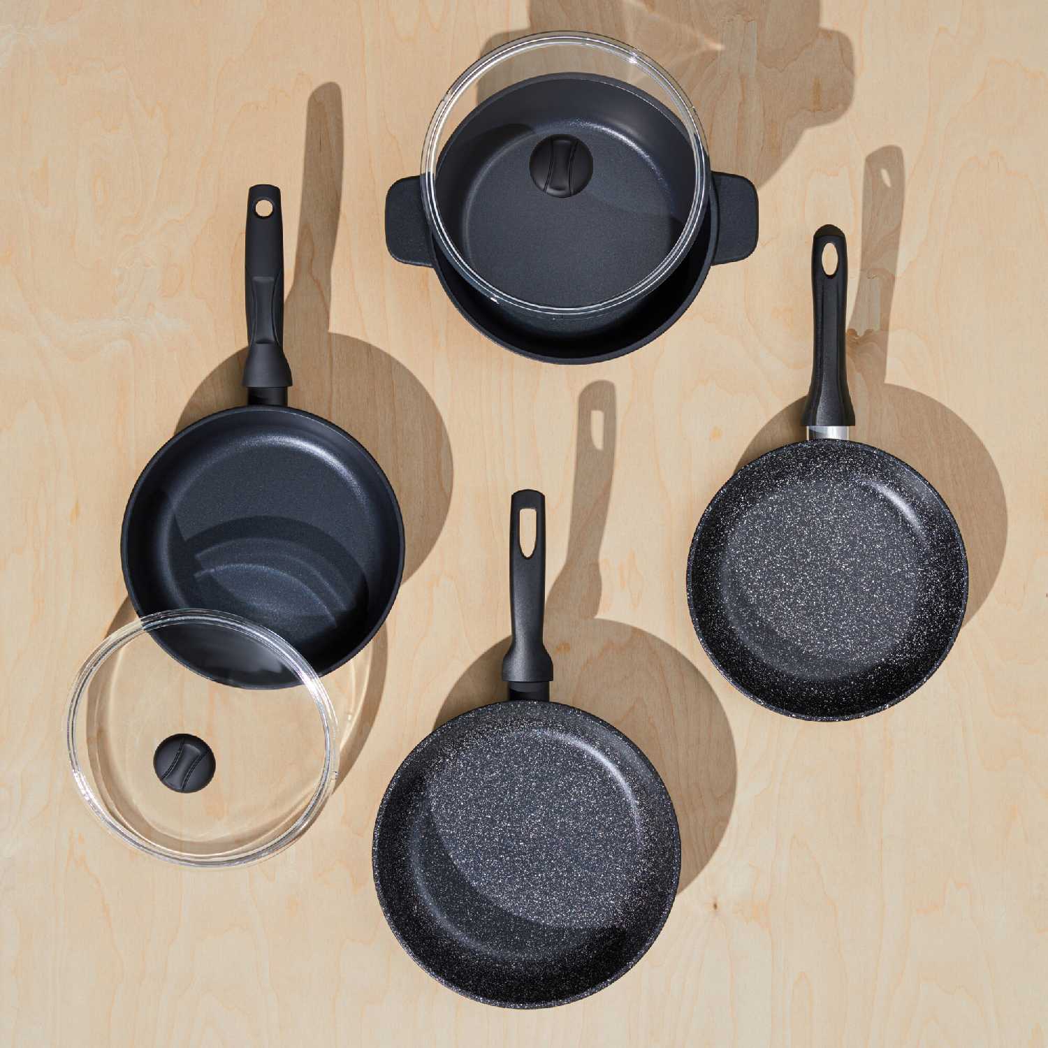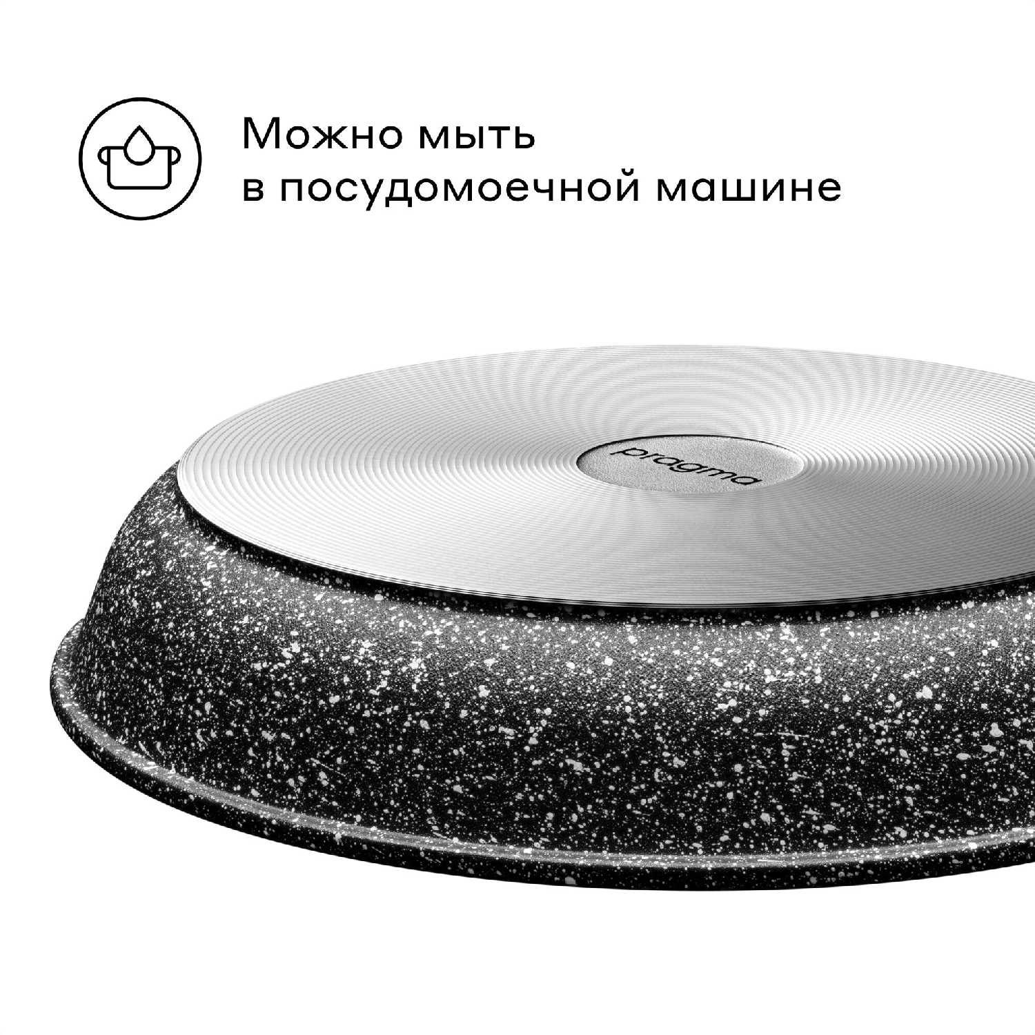 Основным материалом корпуса является литой алюминий, что обеспечивает оптимальное соотношение прочности и веса, в отличие от штампованных аналогов. Толстое дно эффективно аккумулирует и распределяет тепло, предотвращая локальные перегревы и обеспечивая стабильность температурного режима. Антипригарное покрытие с гранитным или мраморным эффектом наносится единым слоем без швов как на внутреннюю, так и на внешнюю поверхности. Ручка выполнена с прорезиненным покрытием, которое не нагревается чрезмерно и обеспечивает надежный захват во время приготовления.