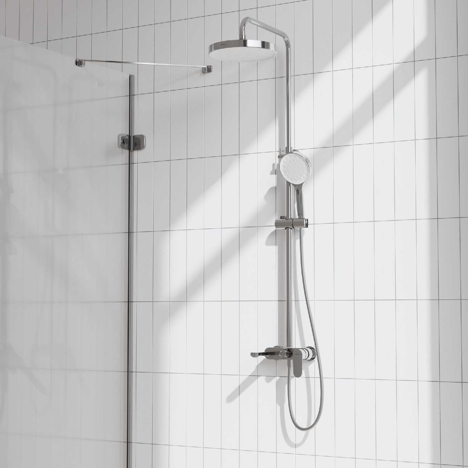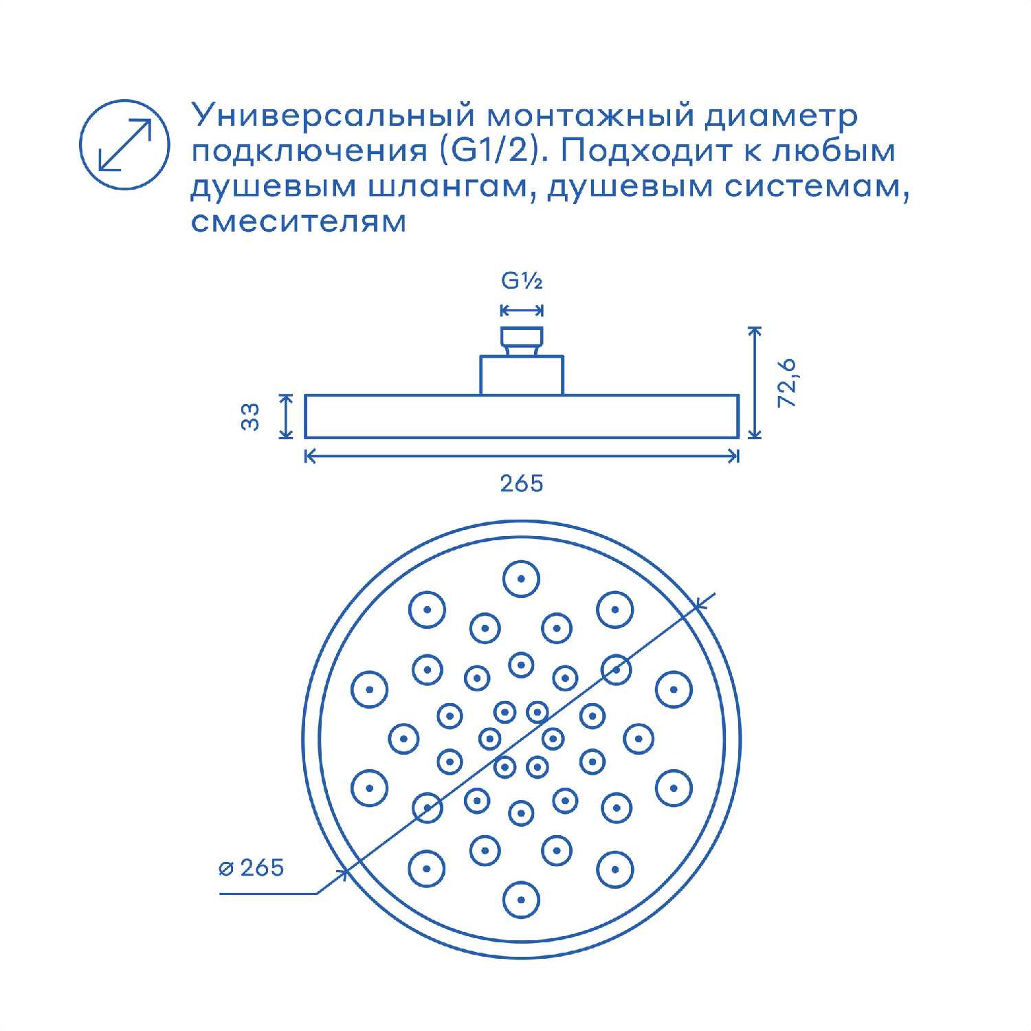 Диаметр составляет 28-32 см при толщине корпуса 4 см, что обеспечивает зону покрытия 60-70 см в диаметре. Для небольших душевых кабин (менее 80×80 см) такой размер может вызвать неудобства из-за близкого расположения к телу. -