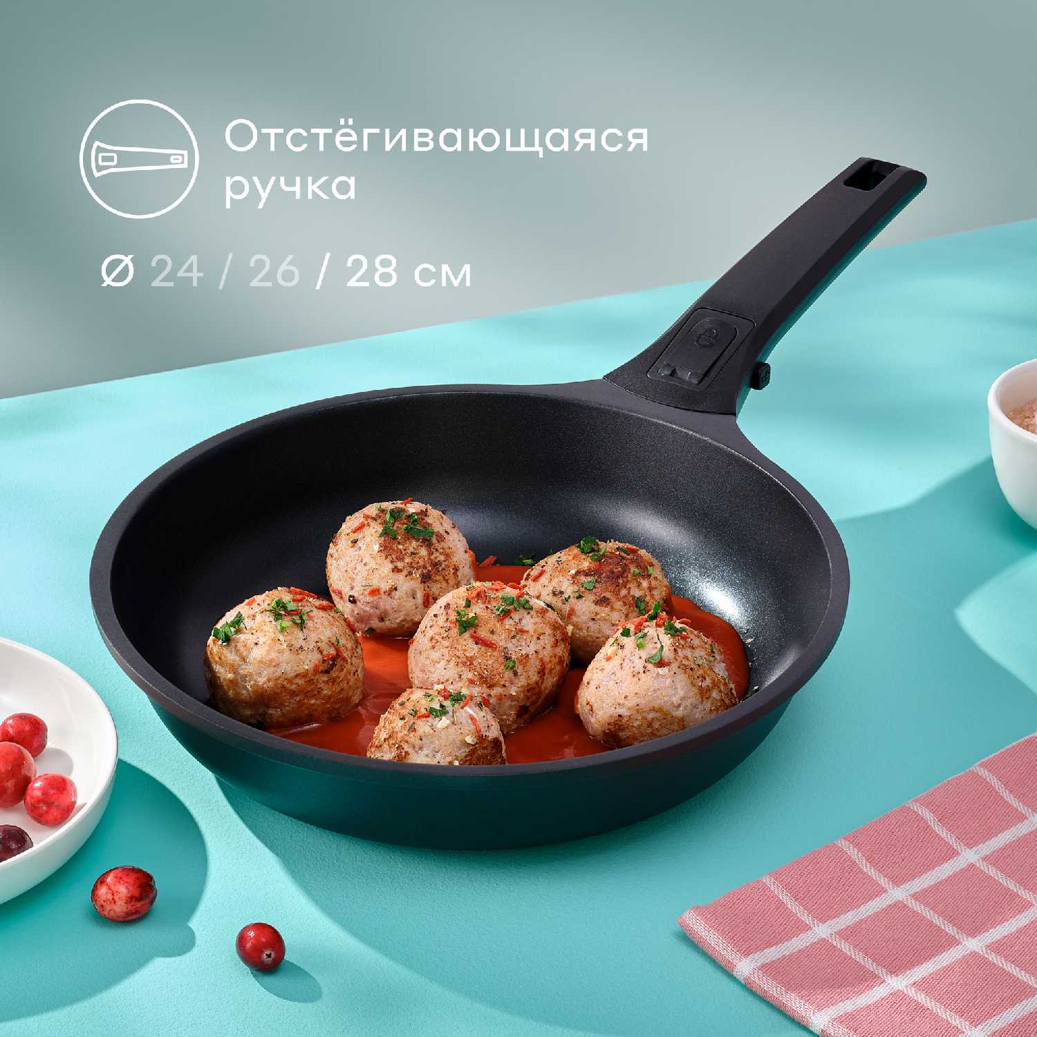 Отстёгивающаяся ручка — отдельный плюс. Удобно для хранения, можно использовать сковороду в духовке или ставить в холодильник, не занимая много места. Механизм крепления надёжный, не люфтит.