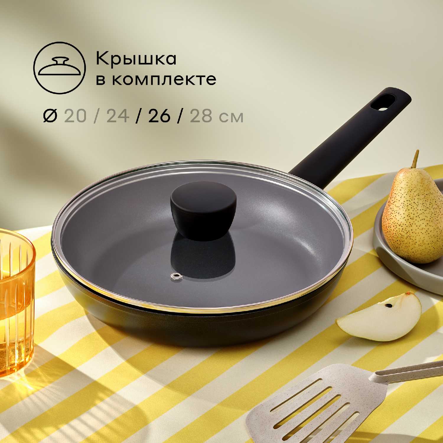 Корпус выполнен из литого алюминия с толстым дном, обеспечивающим стабильный нагрев, а ручка — из мягкого термостойкого силикона. Покрытие демонстрирует высокую стойкость к пригоранию при правильном использовании, но чувствительно к перегреву без масла. Стеклянная крышка практична для контроля готовки, но её крепления могут иметь люфт. -