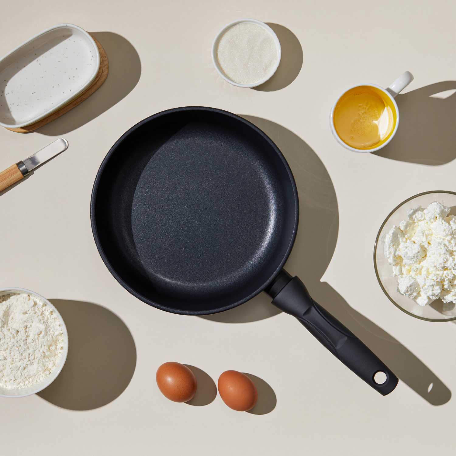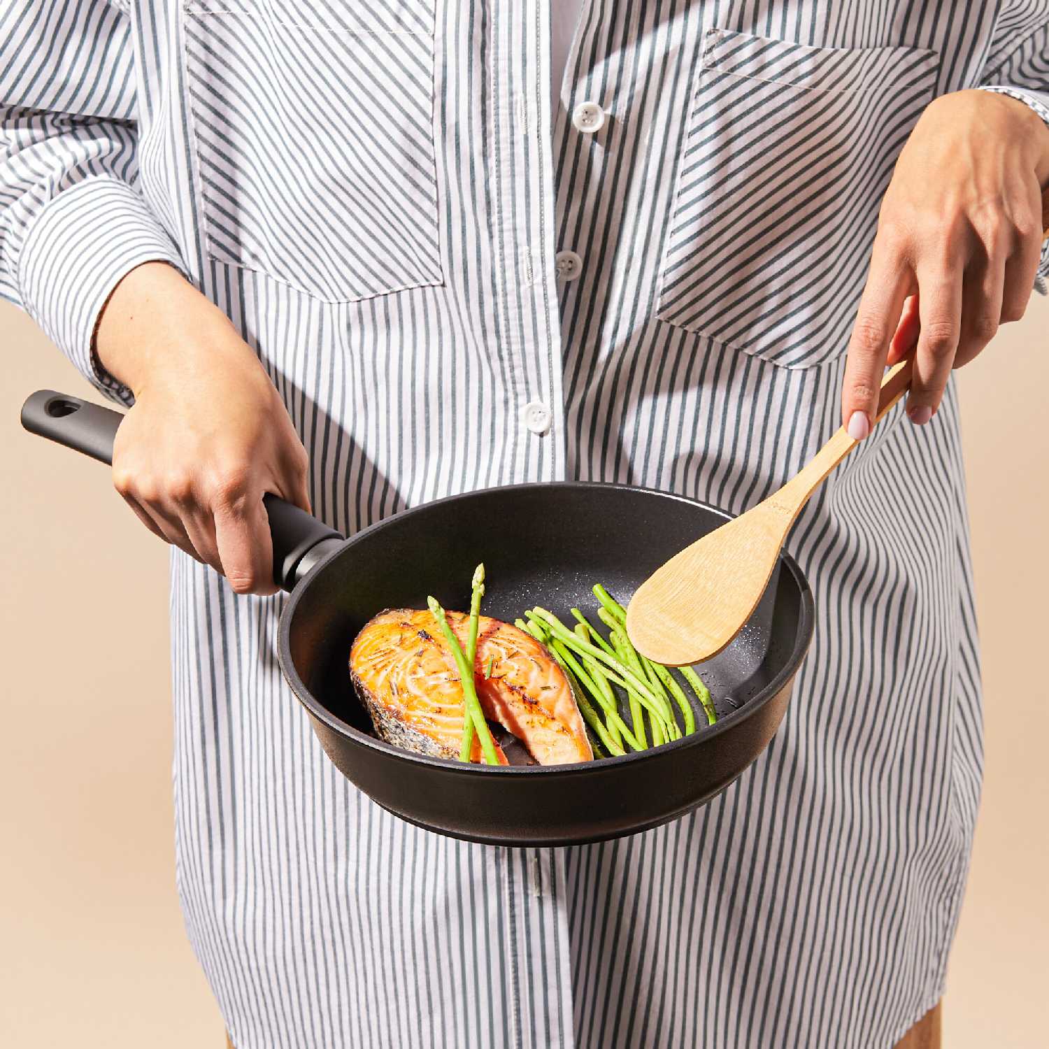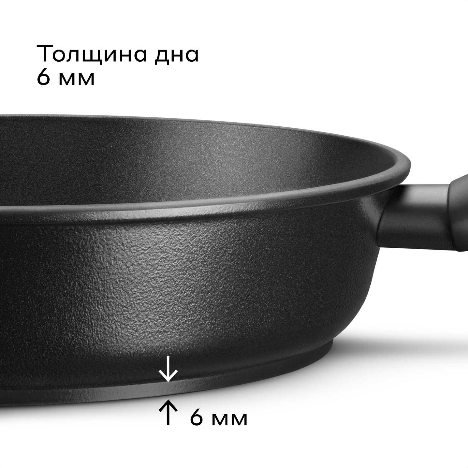 Дно толщиной 6 мм обеспечивает инерционный нагрев: сковорода долго разогревается, но затем стабильно удерживает температуру даже после выключения плиты. Это предотвращает локальный перегрев, еда не пригорает по краям, а тушёные блюда "доходят" без кипения. Однако для быстрой жарки яичницы это может быть минусом — требуется терпение при предварительном прогреве. -