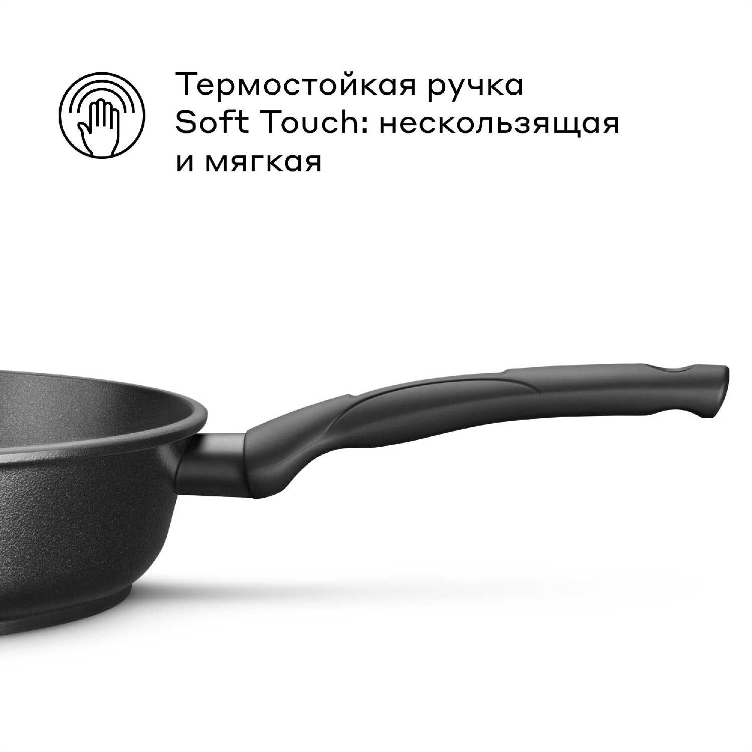 Ручка не нагревается при готовке, благодаря термоизолирующему покрытию, и имеет рельефную поверхность против скольжения. Даже при заполненной тяжёлой сковороде её удобно приподнимать или сдвигать. Минус — несъёмная конструкция, что усложняет хранение в компактных шкафах.