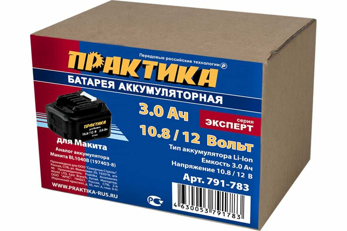 | Дополнительная информация : | Аккумулятор для MAKITA ПРАКТИКА 10.8/12В, 3.0Ач, Li-Ion, Слайдер, коробка (791-783), шт |
