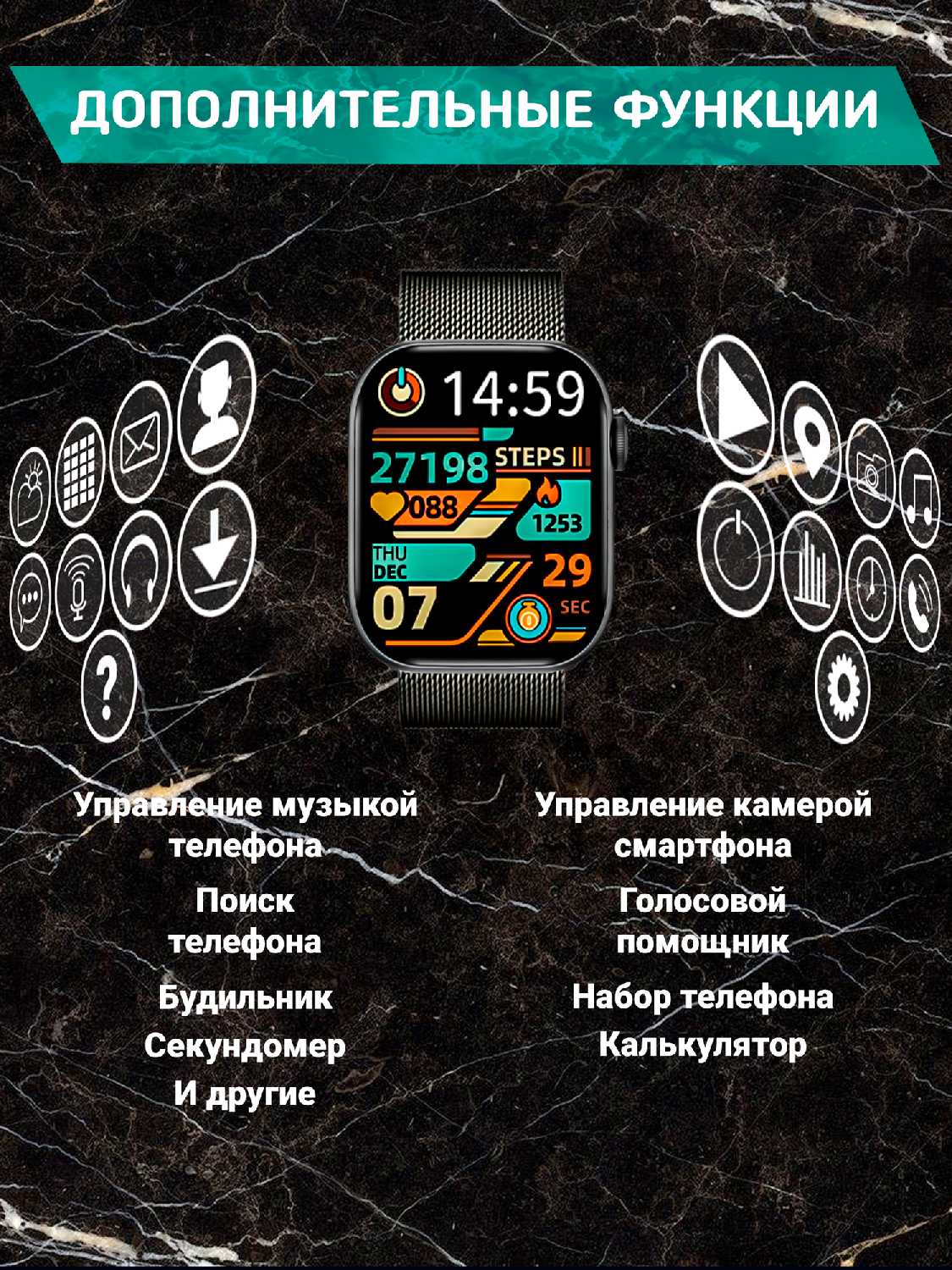 | Дополнительные функции : | будильник, вибрация, диктофон, динамик, календарь, калькулятор, компас, микрофон, секундомер, таймер, шагомер |