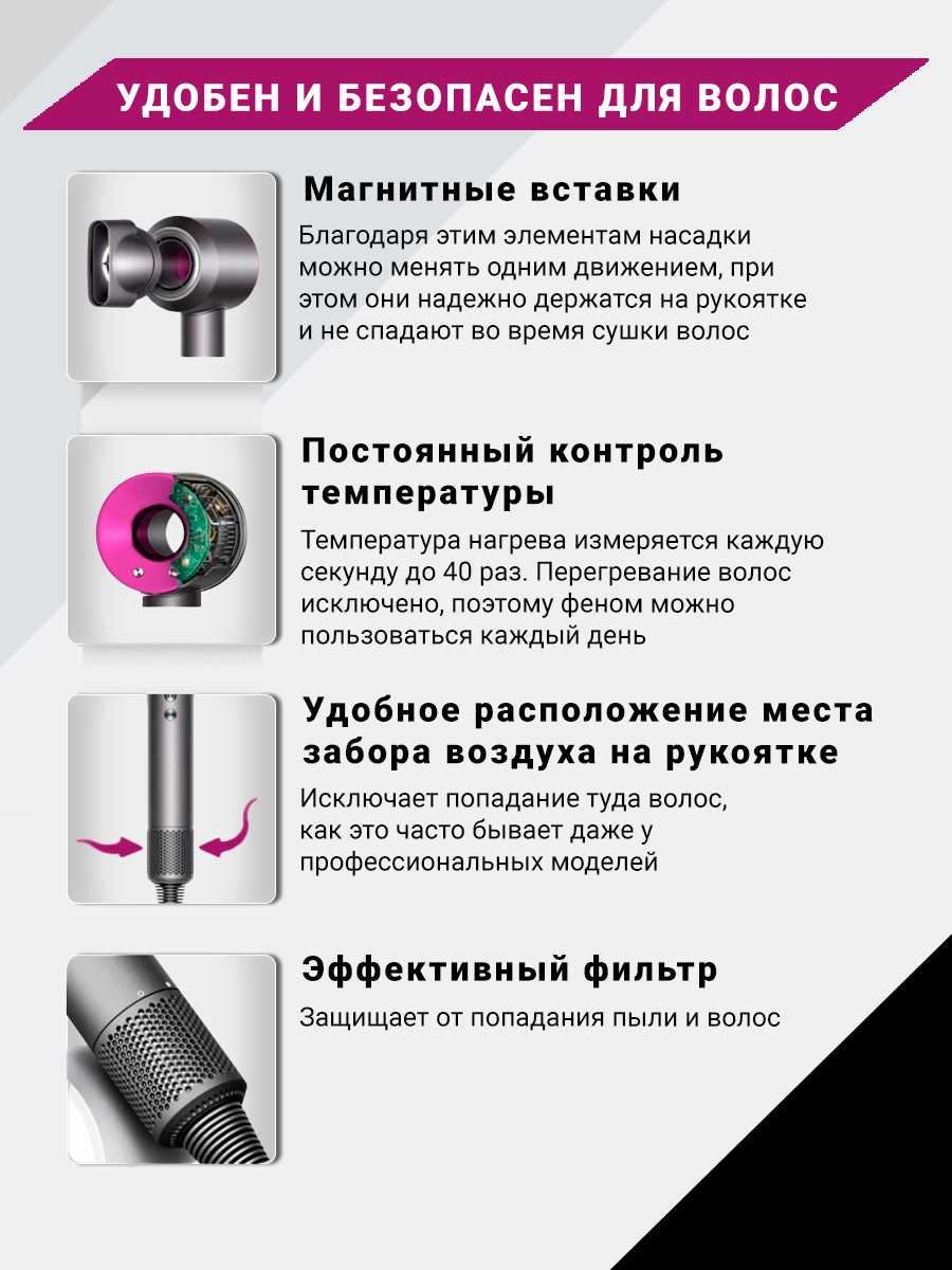Насадки рабочие, реальный эффект есть. - - Шнур в основании фена недостаточно жёстко закреплён; пластиковая крышка фильтра очень хлипкая, требуется осторожное обращение.