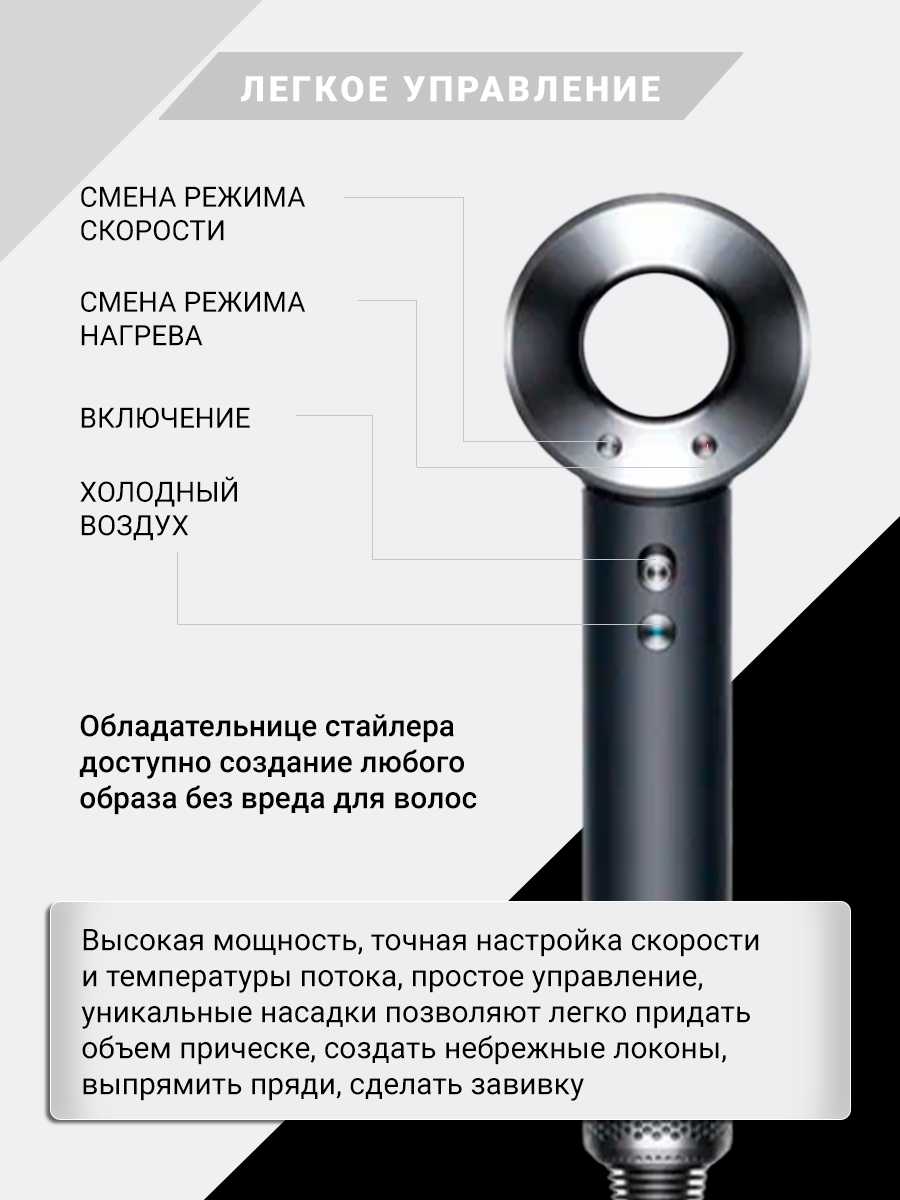 У него всё есть: ионизация, разнообразные насадки, регулировка температуры, длинный шнур, который так удобно держать в руке.