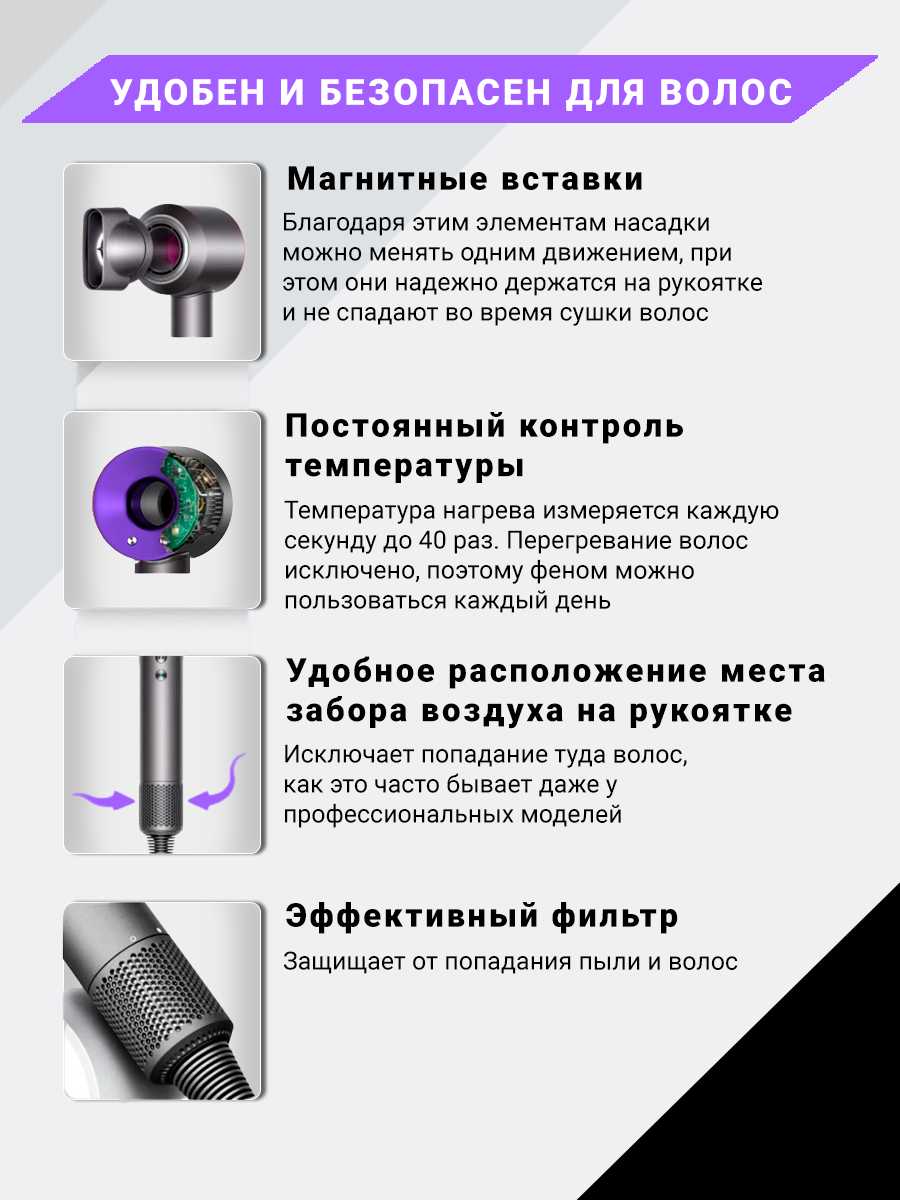 Оригинальным дайсоном не пользовалась, сравнить не могу. До этого был профессиональный фен, хороший, мощный, с функцией холодной сушки. Данный фен брала как второй, хотела ходить с ним в бассейн, привлекли отзывы о мощности, малые габариты и удобная форма (не буквой Г, а в форме микрофона по сути, так намного удобнее класть в сумку в бассейн). По итогу данный фен стал основным домашним феном, т.к оказался восхитительным! Действительно потрясающе мощный, очень тихий, эргономичный. При прежнем уходе за волосами (шампунь не меняла, мою голову через день как и всегда) волосы стали блестящие, улучшился натуральный цвет волос, все начали спрашивать не покрасилась ли я - сушу волосы с насадкой для бережной сушки. Еще очень понравилась насадка для непослушных волос - эффект как после утюжка, только без вреда для волос. Остальными насадками не пользуюсь, т.к. не имею необходимого для них объёма или длины волос. Все насадки на магнитах, очень классное ощущение, держатся хорошо, не слетают. Фен очень легкий, рука не устает. В быту использую вторую мощность обдува из трех и первую мощностью температуры - этого хватает, чтобы высушить волосы за минут 5-7.