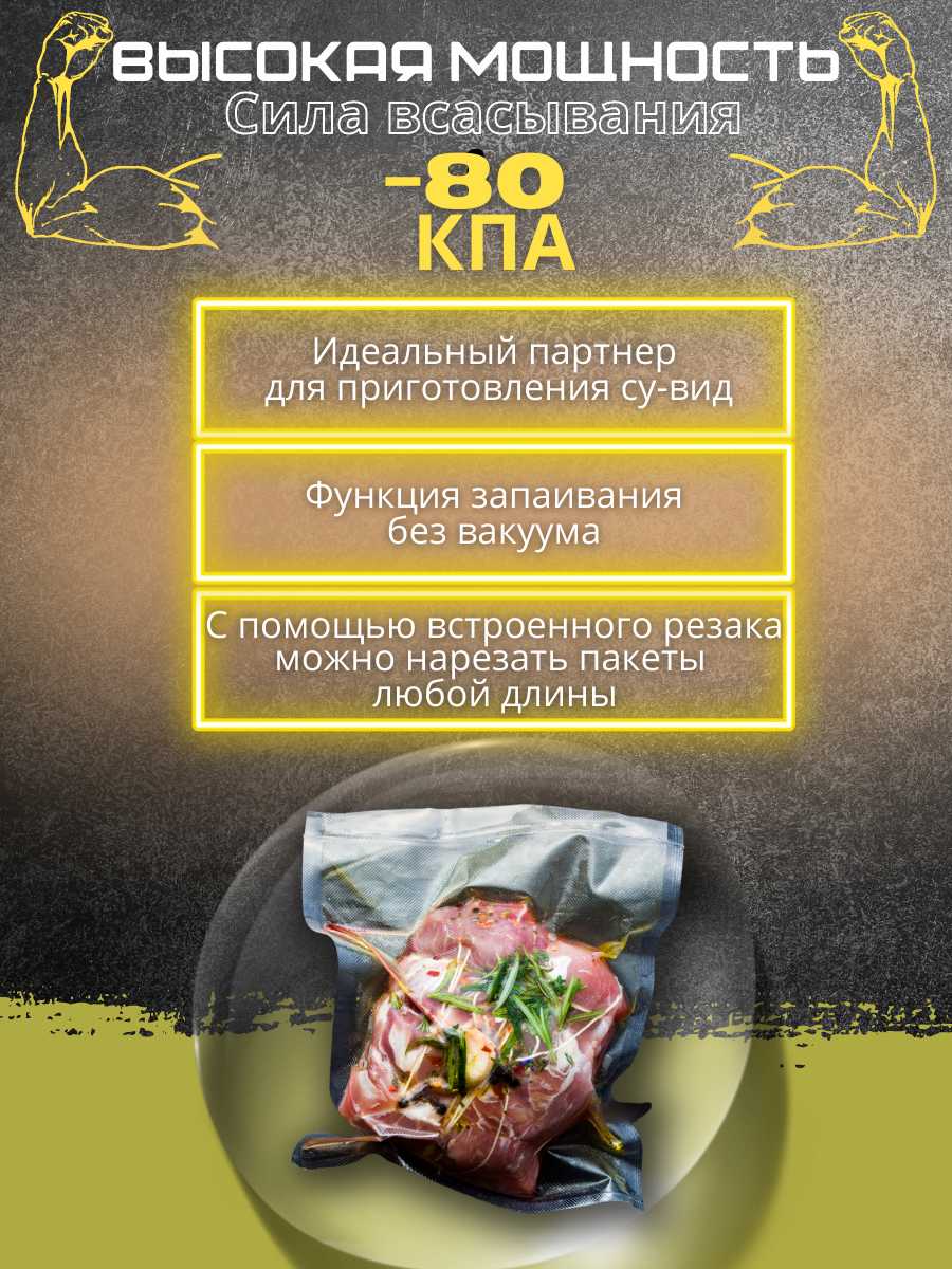 Для лучшего результата рекомендуется использовать вакуумные пакеты: мясо предварительно маринуют с приправами (например, копчёной солью и чесноком). Важно плотно запечатывать пакеты — встроенный резак и спайка швов упрощают этот процесс. -