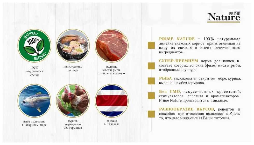 | Дополнительная информация : | Prime Nature – 100% натуральная линейка влажных кормов приготовленная на пару из свежих и высококачественных ингредиентов. Супер-премиум корма для кошек, в составе которых волокна (филе) мяса и рыбы, отобранные вручную. Рыба выловлена в открытом море, курица, выращенная без гормонов. Без ГМО, искусственных красителей, стимуляторов аппетита и ароматизаторов |